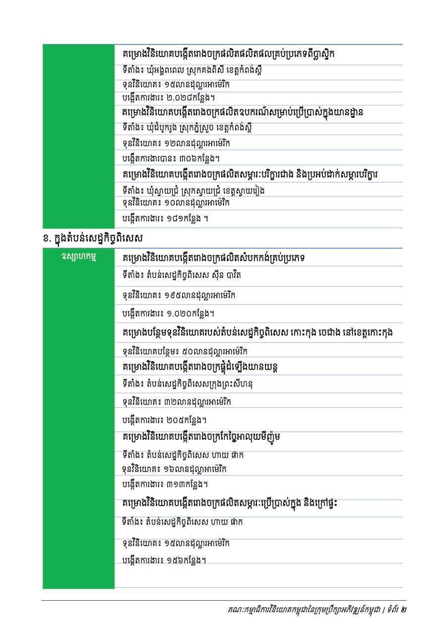 ក្នុងខែមករា ឆ្នាំ២០២៥កន្លងទៅថ្មីៗនេះ ក្រុមប្រឹក្សាអភិវឌ្ឍន៍កម្ពុជាបានអនុម័តគម្រោងវិនិយោគសរុប ចំនួន ៦៨គម្រោង ក្នុងនោះគម្រោងវិនិយោគថ្មីចំនួន ៦៤គម្រោង និងគម្រោងពង្រីកផលិតកម្មចំនួន ៤គម្រោង ដែលមានទុនវិនិយោគសរុបប្រមាណ ៧៤៨លានដុល្លារអាម៉េរិក និងអាចបង្កើតការងារបានប្រមាណជិត ៤៦ពាន់កន្លែង។