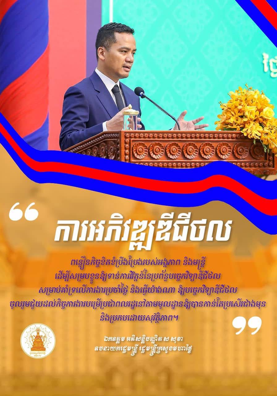 លោកអភិសន្តិបណ្ឌិត ស សុខា ឧបនាយករដ្ឋមន្ត្រី រដ្ឋមន្ត្រីក្រសួងមហាផ្ទៃ បន្តថា ៖ «ការអភិវឌ្ឍឌីជីថល»ពន្លឿនកិច្ចខិតខំប្រឹងប្រែងរបស់អង្គភាព និងមន្ត្រី ដើម្បីសម្របខ្លួនឱ្យទាន់ការវិវត្តន៍នៃប្រព័ន្ធបច្ចេកវិទ្យាឌីជីថល សម្រាប់គាំទ្រលើការងារប្រចាំថ្ងៃ និងធ្វើយ៉ាងណា ឱ្យបច្ចេកវិទ្យាឌីជីថល ចូលរួមជួយដល់កិច្ចការងារបម្រើប្រជាពលរដ្ឋនៅតាមមូលដ្ឋានឱ្យបានកាន់តែប្រសើរជាងមុន និងប្រកបដោយសុវត្ថិភាព៕
