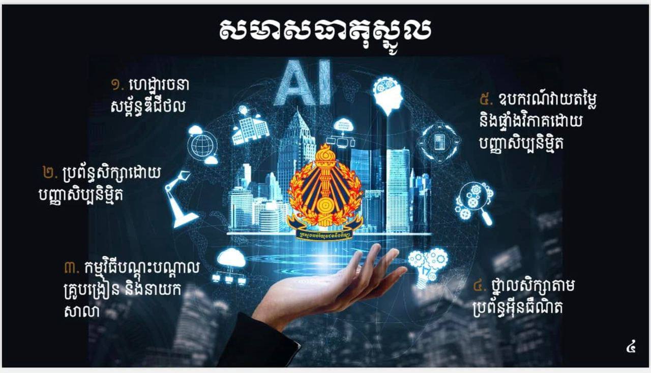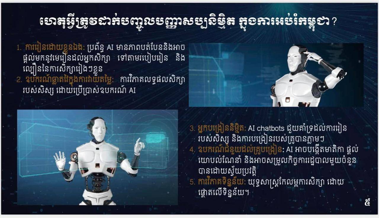 បន្ថែមពីនេះ លោករដ្ឋមន្ត្រី បានសង្កត់ធ្ងន់ថា កន្លងទៅក្រសួងបានបញ្ជៀបការបណ្ដុះបណ្ដាលពីការប្រើប្រាស់ AI នៅតាមគ្រឹះស្ថានបណ្ដុះបណ្ដាលគ្រូ និងតាមសាលារៀនជំនាន់ថ្មីរួចហើយ ខណៈកំពុងរៀបចំកម្មវិធីបណ្ដុះបណ្ដាល បរិញ្ញាបត្រ AI, Cyber Security និងវិទ្យាសាស្ត្រទិន្នន័យនៅវិទ្យាស្ថានបច្ចេកវិទ្យាកម្ពុជា។ បន្ថែមលើនេះថ្នាលបច្ចេកវិទ្យា AI មួយដែលអាចឱ្យយុវជនកម្ពុជាចូលប្រើប្រាស់ក៏បានរៀបចំហើយផងដែរ។