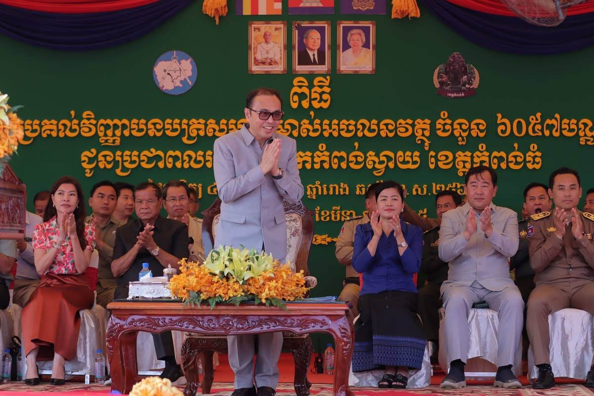 ខេត្តកំពង់ធំ ៖ លោក វង្សី វិស្សុត ឧបនាយករដ្ឋមន្រ្តីប្រចាំការ រដ្ឋមន្រ្តីទទួលបន្ទុកទីស្តីការ គណៈរដ្ឋមន្ត្រី និងជាប្រធានក្រុមការងាររាជរដ្ឋាភិបាលចុះមូលដ្ឋានខេត្តកំពង់ធំ អញ្ជើញចូលរួមក្នុងពិធីចែកវិញ្ញាបនបត្រសម្គាល់ម្ចាស់អចលនវត្ថុ ចំនួន ៦.០៥៧បណ្ណ ស្មើនឹង ២.៦៩២គ្រួសារ ជូនប្រជាពលរដ្ឋ ០៤ភូមិ រួមមាន ភូមិល្វា ភូមិត្រពាំងអារក្ស ភូមិមហរ៍ និងភូមិព្រៃទប់ ស្ថិតនៅឃុំជ័យ ស្រុកកំពង់ស្វាយ ខេត្តកំពង់ធំ នាព្រឹកថ្ងៃទី០២ ខែមីនា ឆ្នាំ២០២៥។