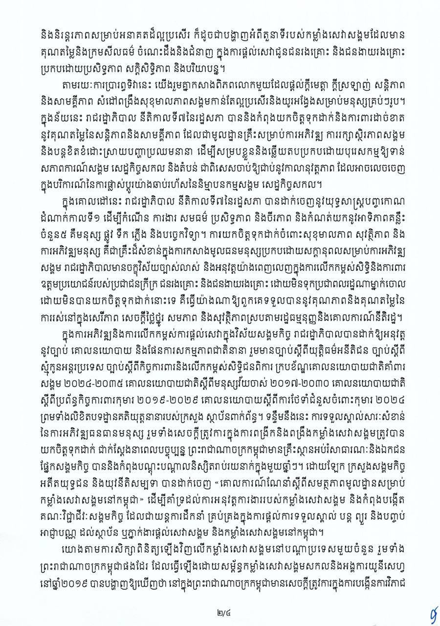ឆ្លៀតក្នុងឱកាសដ៏ប្រពៃនេះ ក្នុងនាមរាជរដ្ឋាភិបាល ទូលព្រះបង្គំ ខ្ញុំព្រះករុណា ខ្ញុំសូមសម្តែងនូវ ការកោតសរសើរចំពោះក្រសួងសង្គមកិច្ច អតីតយុទ្ធជន និងយុវនីតិសម្បទា គ្រប់ក្រសួង ស្ថាប័ន រដ្ឋបាល ថ្នាក់ក្រោមជាតិ សមាគម អង្គការមិនមែនរដ្ឋាភិបាលក្នុងស្រុកនិងបរទេស ដៃគូអភិវឌ្ឍ គ្រឹះស្ថានអប់រំ បណ្តុះបណ្តាលសាធារណៈនិងឯកជន និងកម្លាំងសេវាសង្គមទាំងអស់ ដែលបានសម្របសម្រួល លើកកម្ពស់ កិច្ចសហប្រតិបត្តិការ និងចូលរួមផ្តល់សេវាគាំទ្រដល់ជនរងគ្រោះ និងជនងាយរងគ្រោះនៅក្នុងសហគមន៍ តាមរយៈការលុបបំបាត់ភាពក្រីក្រ ការកាត់បន្ថយការរើសអើង ការលើកកម្ពស់យុត្តិធម៌សង្គម ព្រមទាំងការបង្ការ និងឆ្លើយតបចំពោះអំពើហិង្សា ការរំលោភបំពាន ការកេងប្រវញ្ចគ្រប់រូបភាព និងការមិនអើពើ ដើម្បីធានាបាន នូវការអភិវឌ្ឍនិងធ្វើឱ្យសុខុមាលភាពកាន់តែប្រសើរឡើងសម្រាប់ជនរងគ្រោះ និងជនងាយរងគ្រោះ។