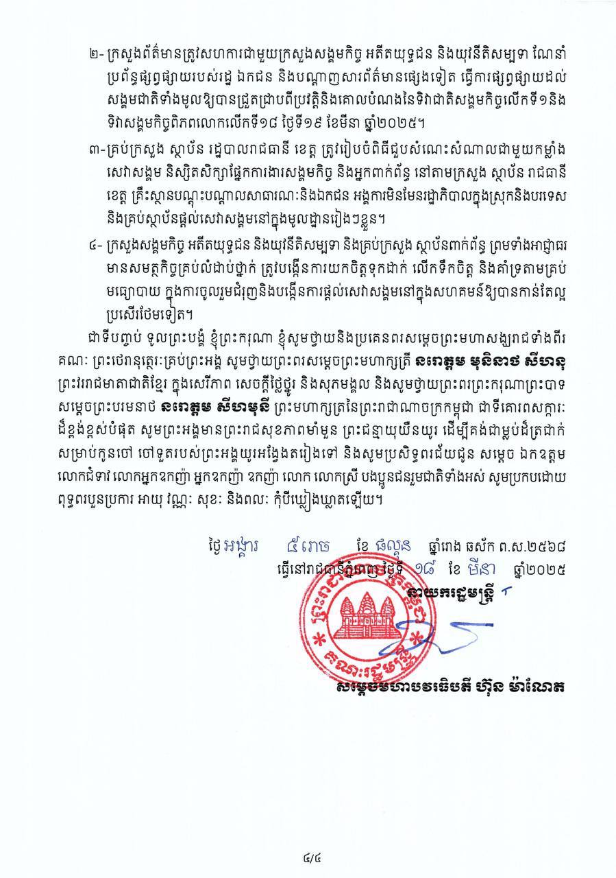 ១- ក្រសួងសង្គមកិច្ច អតីតយុទ្ធជន និងយុវនីតិសម្បទា ត្រូវសហការជាមួយក្រសួង ស្ថាប័នពាក់ព័ន្ធ រៀបចំពិធីអបអរសាទរទិវាជាតិសង្គមកិច្ចលើកទី១និងទិវាសង្គមកិច្ចពិភពលោកលើកទី១៨ ឆ្នាំ២០២៥ ឱ្យបានទូលំទូលាយទាំងនៅថ្នាក់ជាតិនិងថ្នាក់ក្រោមជាតិ ដើម្បីលើកកម្ពស់ការផ្សព្វផ្សាយអំពីតួនាទី ភារកិច្ច គុណតម្លៃរបស់កម្លាំងសេវាសង្គម និងសមិទ្ធផលការងារ។