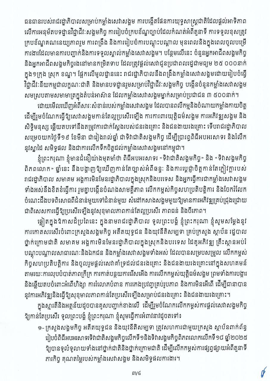 ក្នុងស្មារតីនិងអត្ថន័យដូចបានគូសបញ្ជាក់ខាងលើ ដើម្បីរួមចំណែកលើកកម្ពស់ការផ្តល់សេវាសង្គមកិច្ច ឱ្យកាន់តែប្រសើរ ទូលព្រះបង្គំ ខ្ញុំព្រះករុណា ខ្ញុំសូមធ្វើការអំពាវនាវដូចតទៅ៖