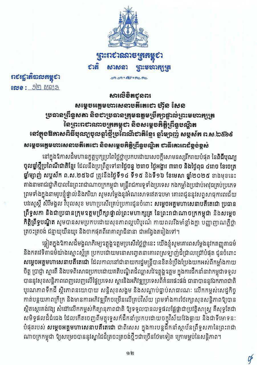 នៅក្នុងឱកាសដ៏មហានក្ខត្តឫក្សប្រពៃថ្លៃថ្លាប្រកបដោយសេចក្តីសោមនស្សរីករាយបំផុត នៃពិធីបុណ្យ ចូលឆ្នាំថ្មីប្រពៃណីជាតិខ្មែរ ដែលនឹងប្រព្រឹត្តទៅនាថ្ងៃចន្ទ ២រោច ថ្ងៃអង្គារ ៣រោច និងថ្ងៃពុធ ៤រោច ខែចេត្រ ឆ្នាំម្សាញ់ សប្តស័ក ព.ស.២៥៦៨ ត្រូវនឹងថ្ងៃទី១៤ ទី១៥ និងទី១៦ ខែមេសា ឆ្នាំ២០២៥ ខាងមុខនេះ តាងនាមរាជរដ្ឋាភិបាលនៃព្រះរាជាណាចក្រកម្ពុជា មន្ត្រីរាជការទូទាំងប្រទេស កងកម្លាំងប្រដាប់អាវុធគ្រប់ប្រភេទ ព្រមទាំងក្នុងនាមរូបខ្ញុំផ្ទាល់និងភរិយា សូមសម្តែងនូវអំណរសាទរឥតឧបមា គោរពជូននូវសព្ទសាធុការពរជ័យ បវរសួស្តី សិរីមង្គល វិបុលសុខ មហាប្រសើរគ្រប់ប្រការជូនចំពោះ សម្តេចអគ្គមហាសេនាបតីតេជោ ប្រធាន ព្រឹទ្ធសភា និងជាប្រធានក្រុមឧត្តមប្រឹក្សាផ្ទាល់ព្រះមហាក្សត្រ នៃព្រះរាជាណាចក្រកម្ពុជា និងសម្តេច កិត្តិព្រឹទ្ធបណ្ឌិត សូមបានសមប្រកបដោយសុខភាពល្អបរិបូរណ៍ កាយពលរឹងមាំខ្លាំងក្លា បញ្ញាញាណភ្លឺថ្លា ត្រចះត្រចង់ ជន្មាយុយឺនយូរ និងចាកផុតពីរោគាព្យាធិនានា ជាអង្វែងតរៀងទៅ។