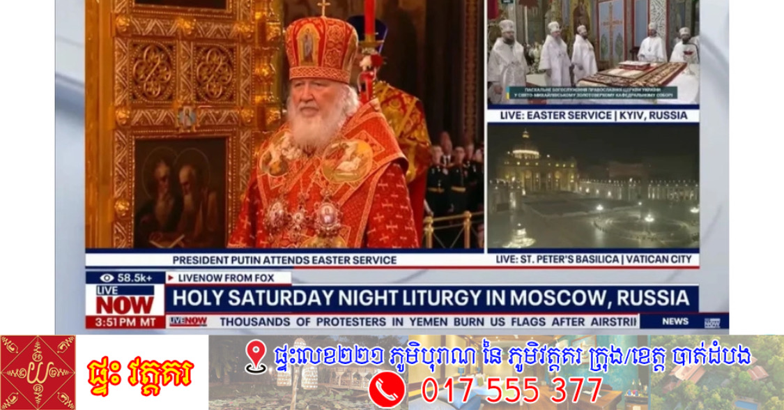 កាលពីថ្ងៃទី 20 ខែមេសា គេហទំព័រព័ត៌មានអ៊ុយក្រែនជាច្រើន រួមទាំង RBC-Ukraine បានរាយការណ៍ថា ប៉ុស្តិ៍ទូរទស្សន៍ Fox News របស់អាមេរិកបានផ្សាយវីដេអូអំពីការប្រារព្ធពិធីបុណ្យ Easter ដែលធ្វើឡើងនៅជុំវិញពិភពលោក រួមទាំងពិធីនៅទីក្រុងមូស្គូ ដែលមានការចូលរួមដោយប្រធានាធិបតីរុស្ស៊ី លោក វ្ល៉ាឌីមៀរ ពូទីន។