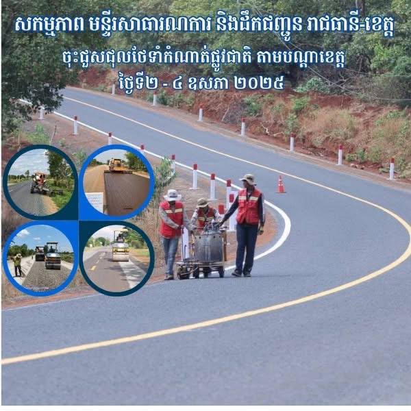 ក្រសួងថា «នៅថ្ងៃទី២ – ៤ ឧសភា ២០២៥ ក្រុមការងារមន្ទីរសាធារណការ និងដឹកជញ្ជូន ខេត្តស្ទឹងត្រែង ក្រចេះ មណ្ឌលគិរី រតនគិរី បន្ទាយមានជ័យ ឧត្តរមានជ័យ សៀមរាប ព្រះវិហារ កំពង់ធំ កំពង់ឆ្នាំង ពោធិ៍សាត់ បាត់ដំបង ប៉ៃលិន កណ្តាល កំពត កែប កំពង់ស្ពឺ ព្រះសីហនុ កោះកុង តាកែវ ត្បូងឃ្មុំ កំពង់ចាម ព្រៃវែង និងខេត្តស្វាយរៀង បានចុះជួសជុលថែទាំលើផ្លូវជាតិសំខាន់ៗ នៅតាមបណ្ដាខេត្តរបស់ខ្លួន»។