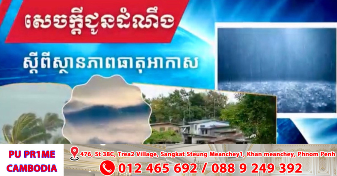 ភ្នំពេញ៖ ក្រសួងធនធានទឹក និងឧតុនិយម នៅព្រឹកថ្ងៃសុក្រទី០៩ ខែឧសភា ឆ្នាំ២០២៥នេះ បានចេញសេចក្ដីជូនដំណឹងស្តីពីស្ថានភាពធាតុអាកាសនៅព្រះរាជាណាចក្រកម្ពុជា ខណៈសម្ពាធទាបគ្របដណ្តប់លើសមុទ្រចិនខាងត្បូង អាងទន្លេមេគង្គ ឈូងសមុទ្រថៃ និងលើ ព្រះរាជាណាចក្រកម្ពុជា។