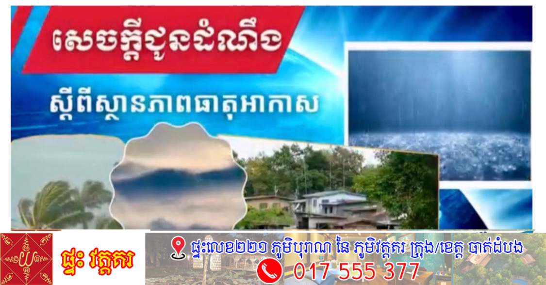 ក្រសួងធនធានទឹក និងឧតុនិយម សូមគោរពជម្រាបជូនអំពីស្ថានភាពធាតុអាកាសនៅព្រះរាជាណាចក្រកម្ពុជា សម្រាប់ថ្ងៃទី៣០ ខែឧសភា ឆ្នាំ២០២៥ ៖
