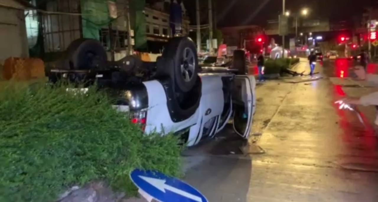 ភ្នំពេញ៖ បុរសម្នាក់រួមដំណើរជាមួយនិងមនុស្ស៤នាក់ទៀតសង្ស័យស្រវឹងស្រាបានបើករថយន្តម៉ាក TACOMA ០១គ្រឿងបោះពួយយ៉ាងលឿនឡើងវ៉ាជែងនិងរថយន្តនៅពីមុខក៏រេចង្កូតឡើងសួនផ្លូវ បន្តទៅបុកបង្គោលស្លាកសញ្ញាផ្សាយពាណិជ្ជកម្មបាក់០១ ដើម បណ្ដាលអោយរថយន្តក្រឡាប់ផ្ងារជើងទ្រមេឃ ខូចខាតយ៉ាងធ្ងន់ធ្ងរ ។