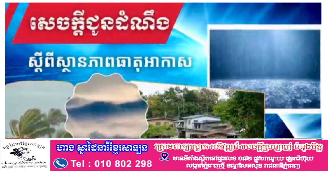 ភ្នំពេញ៖ ក្រសួងធនធានទឹក និងឧតុនិយម នៅព្រឹកថ្ងៃទី០៨ ខែមិថុនា ឆ្នាំ២០២៥នេះ បានចេញសេចក្ដីជូនដំណឹងស្តីពីស្ថានភាពធាតុអាកាសនៅព្រះរាជាណាចក្រកម្ពុជា ខណៈខ្យល់មូសុងនិរតីជាមួយសម្ពាធទាបដែលគ្របដណ្តប់ លើឈូងសមុទ្រថៃ អាងទន្លេមេគង្គ និងសមុទ្រចិនខាងត្បូង មានឥទ្ធិពលមកលើព្រះរាជាណាចក្រកម្ពុជា។