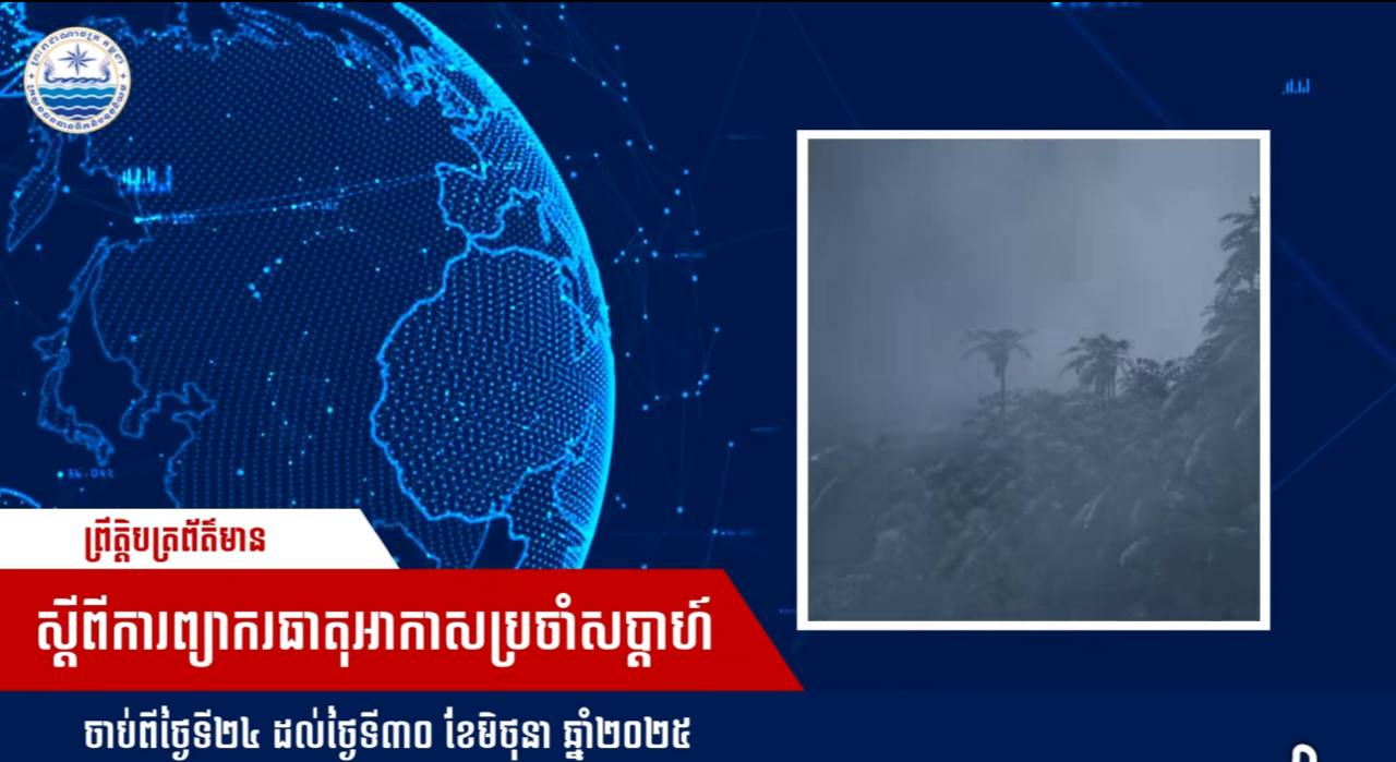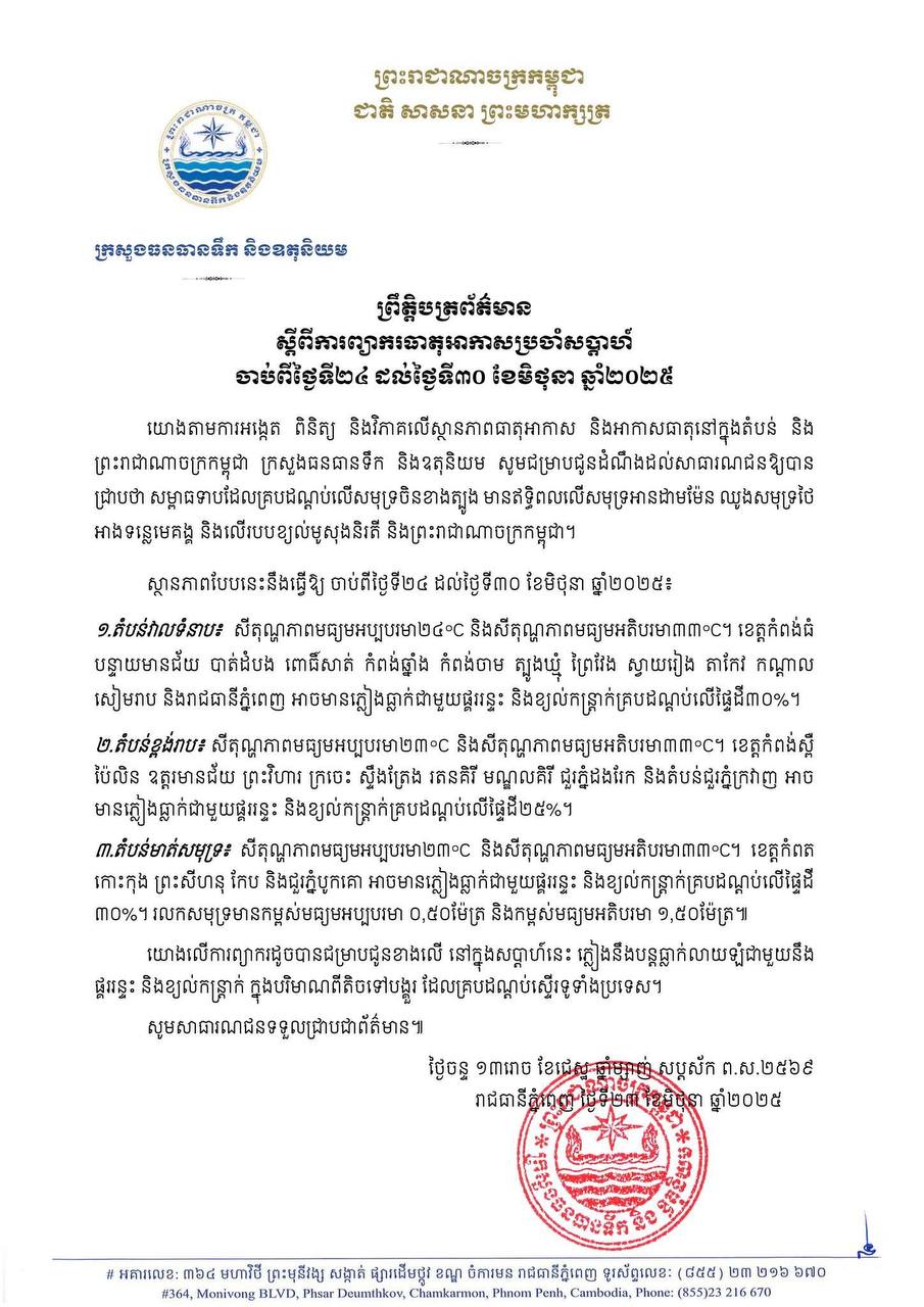 ភ្នំពេញ៖ យោងតាមការអង្កេត ពិនិត្យ និងវិភាគលើស្ថានភាពធាតុអាកាស និងអាកាសធាតុនៅក្នុងតំបន់ និង ព្រះរាជាណាចក្រកម្ពុជា ក្រសួងធនធានទឹក និងឧតុនិយម នៅថ្ងៃទី២៣ ខែមិថុនា ឆ្នាំ២០២៥នេះ សូមជម្រាបជូនដំណឹងដល់សាធារណជនឱ្យបាន ជ្រាបថា សម្ពាធទាបដែលគ្របដណ្តប់លើសមុទ្រចិនខាងត្បូង មានឥទ្ធិពលលើសមុទ្រអានដាមម៉ែន ឈូងសមុទ្រថៃ អាងទន្លេមេគង្គ និងលើរបបខ្យល់មូសុងនិរតី និងព្រះរាជាណាចក្រកម្ពុជា។