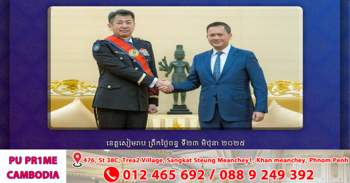ភ្នំពេញ៖ នាព្រឹក ថ្ងៃទី២៣ ខែមិថុនា ឆ្នាំ២០២៥, សម្តេចមហាបវរធិបតី ហ៊ុន ម៉ាណែត នាយករដ្ឋមន្ត្រីនៃព្រះរាជាណាចក្រកម្ពុជា បានអនុញ្ញាតឱ្យ នាយឧត្តមសេនីយ៍ MORISHITA Yasunori មេបញ្ជាការកងស្វ័យការពារជើងគោកជប៉ុន ចូលជួបសម្ដែងការគួរសម និងពិភាក្សាការងារ នៅសណ្ឋាគារសុខាអង្គរ ខេត្តសៀមរាប។