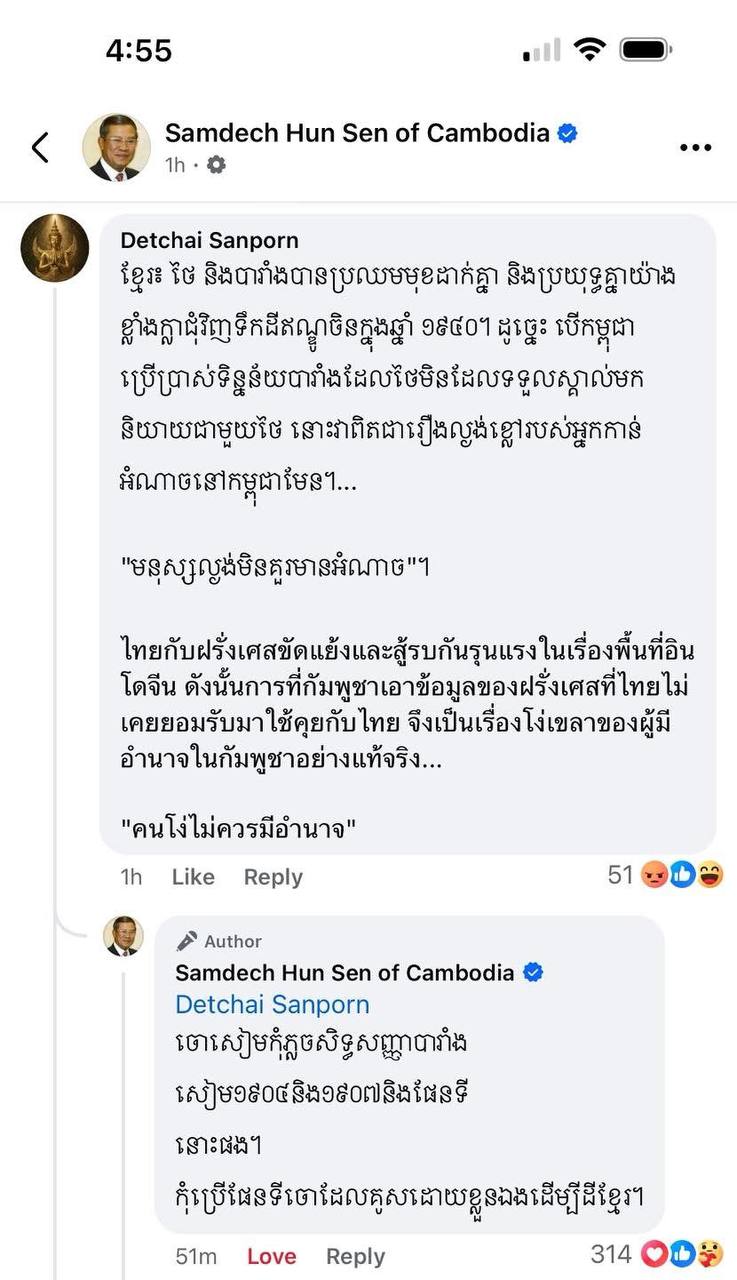 តាមរយៈចូលទៅឆ្លើយជាមួយបងប្អូនប្រជាពលរដ្ឋ នៅលើ Facebook នៅរសៀលថ្ងៃទី២៤ ខែមិថុនា ឆ្នាំ២០២៥ សម្តេចតេជោ ហ៊ុន សែន បានបញ្ជាក់ថា «ចោរសៀមកុំភ្លេចសិន្ធិសញ្ញាបារាំង-សៀម ១៩០៤-១៩០៧ និងផែនទីនោះផង។ កុំប្រើផែនទីចោរដែលគូសដោយខ្លួនឯងដើម្បីដីខ្មែរ»។