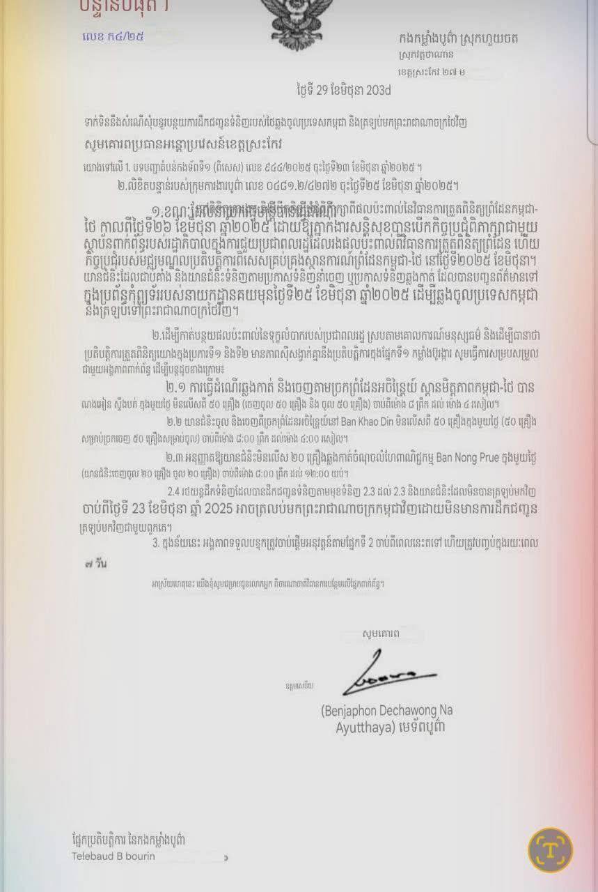 សូមបញ្ជាក់ថា ៖ តែសម្រាប់កម្ពុជា, ថ្នាក់ដឹកនាំយើងបានបញ្ជាក់ហើយថា រឿងបើកច្រកព្រំដែនទាល់តែថៃ បើកដោយឯកតោភាគី ឲ្យដូចមុនថ្ងៃទី៧ ខែមិថុនា ពេលនោះកម្ពុជានឹងបើក យ៉ាងយូរ៥ម៉ោង៕