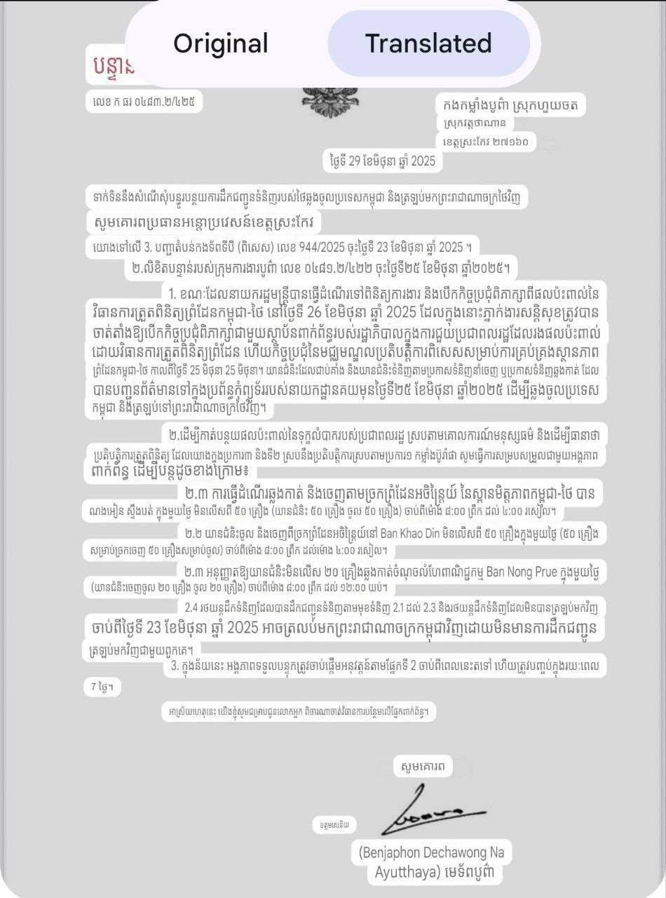 ១. កម្ពុជាយល់ច្បាស់អំពីការលំបាករបស់ប្រជាពលរដ្ឋទាំងខាងកម្ពុជា ទាំងខាងថៃ ដែលរងផលប៉ះពាល់ពីការបិទច្រកព្រំដែន។ ហេតុដូច្នេះហើយ បានជាកម្ពុជាមិនបានប្រើប្រាស់វិធានការបិទច្រកព្រំដែននេះមុនទេ ចាប់តាំងពីមានបញ្ហានៅតំបន់មុំបីកាលពីចុងខែឧសភា ឆ្នាំ២០២៥ ព្រោះយើងមិនមានបំណងបង្កបញ្ហាដែលនាំឲ្យប៉ះពាល់ដល់ការធ្វើដំណើរឬការធ្វើពាណិជ្ជកម្មរបស់ប្រជាជនថៃនិងខ្មែរតាមព្រំដែនទេ។