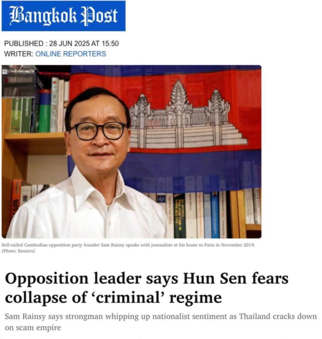 ភ្នំពេញ ៖ លោកបណ្ឌិត គិន ភា ប្រធានវិទ្យាស្ថានទំនាក់ទំនងអន្តរជាតិកម្ពុជា នៅថ្ងៃទី២៩ ខែមិថុនា ឆ្នាំ២០២៥ ម្សិលមុិញ បានថ្លែងថា ៖ វោហាសាស្ត្រនយោបាយរបស់លោក សម រង្ស៊ី ប៉ុន្មានថ្ងៃនេះ ត្រូវបានធ្វើឡើងក្នុងគោលបំណងសំខាន់បីដូចខាងក្រោម ៖
