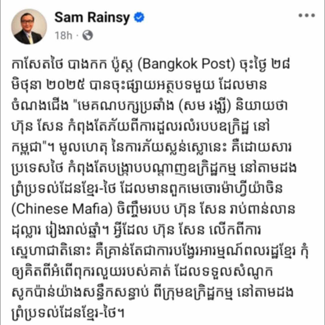 ដូច្នេះ ក្នុងស្ថានភាពនេះ សូមបងប្អូនកុំធ្លាក់ក្នុងអន្ទាក់របស់សាហាយនយោបាយនិងអន្ទាក់របស់បរទេស, សូមអ្នកនយោបាយគ្រប់និន្នាការ អ្នកវិភាគ និងប្រជាពលរដ្ឋគ្រប់មជ្ឈដ្ឋាន ប្រកាន់ជំហរតែមួយជាមួយរាជរដ្ឋាភិបាលនិងកងកម្លាំងប្រដាប់អាវុធយើង និងជឿជាក់លើរាជរដ្ឋាភិបាលយើងជុំវិញចំណាត់ការលើរឿងព្រំដែន និងដំណោះស្រាយនិងវិធានការពាក់ព័ន្ធដទៃទៀត៕
