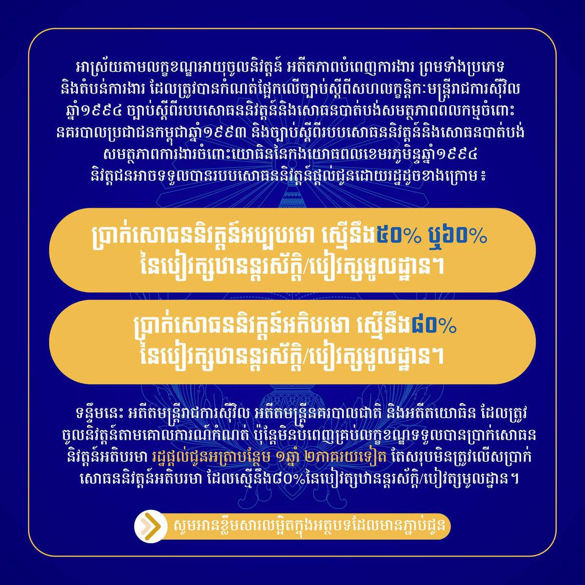 រាជរដ្ឋាភិបាល ក្នុងនីតិកាលទី៧ នៃរដ្ឋសភា ក្រោមការដឹកនាំរបស់ សម្តេចមហាបវរធិបតី ហ៊ុន ម៉ាណែត នាយករដ្ឋមន្ត្រី បានបន្តយកចិត្តទុកដាក់ និងរៀបចំដំឡើងរបបសោធននិវត្តន៍ ព្រមទាំងបានធ្វើឱ្យមានសង្គតិភាព និងសុខដុមនីយកម្មពេញលេញនៃរបបសោធននិវត្តន៍ក្នុងឆ្នាំ២០២៤។ សម្រាប់ឆ្នាំ២០២៥ ប្រាក់សោធននិវត្តន៍អប្បបរមាប្រចាំខែ ត្រូវបានដំឡើងស្មើនឹង ៨៤៥ ០០០រៀល និងនិវត្តជនដែលបានចូលនិវត្តន៍មុនឆ្នាំ២០២៤ ក៏ត្រូវបានផ្តល់ជូនបន្ថែមចំនួន ២០ ០០០រៀលក្នុង ១ខែ ផងដែរ។ ការបើកផ្តល់ប្រាក់សោធននិវត្តន៍ត្រូវបានអនុវត្តតាមគណនីធនាគារជាទៀងទាត់។ បន្ថែមលើនេះ និវត្តជនទាំងអស់ ក៏ទទួលបាននូវការផ្តល់ប្រាក់ឧបត្ថម្ភ ៥ម៉ឺនរៀល ក្នុងឱកាសពិធីបុណ្យចូលឆ្នាំថ្មី និង ៥ម៉ឺនរៀលក្នុងឱកាសបុណ្យភ្ជុំបិណ្ឌថែមទៀត៕