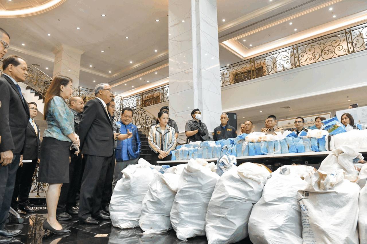លោកស្រី ផែថងថាន ស៊ីណាវ៉ាត្រ ចុះ ពិនិត្យ ការ រឹបអួស ម្សៅ គ្រឿងញៀន។ (FB)