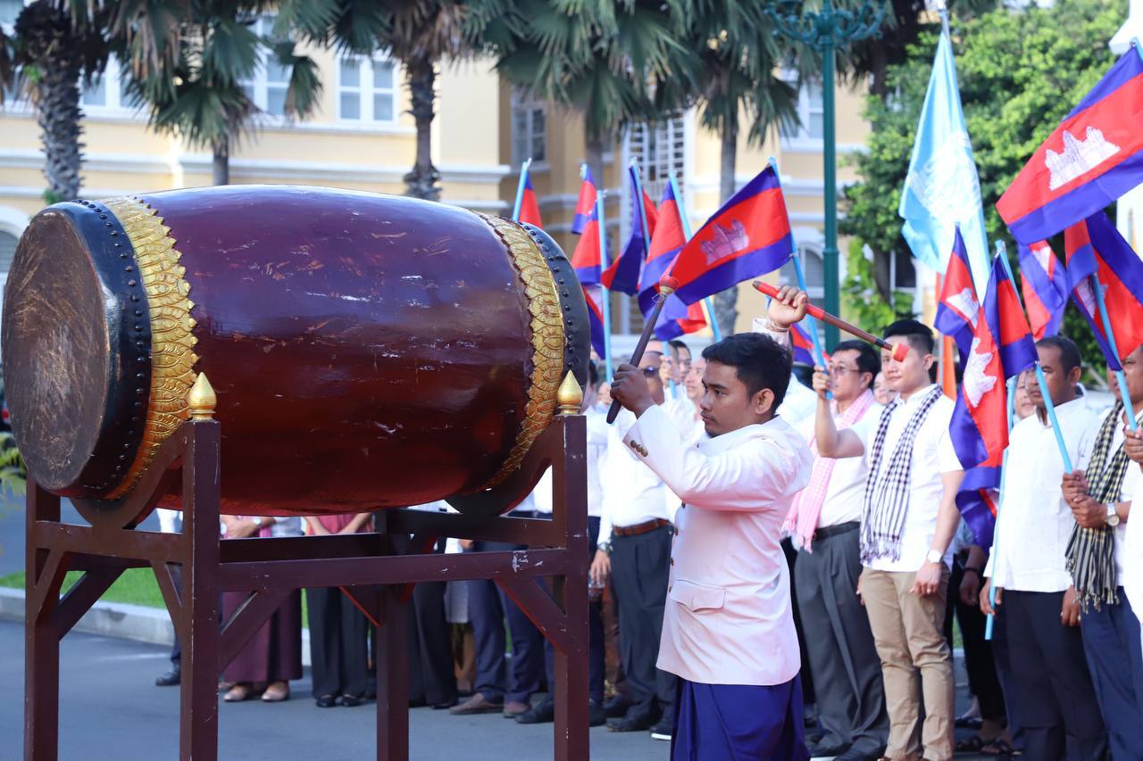 មុននឹងចាប់ផ្តើមពិធីទូងស្គរ ថ្នាក់ដឹកនាំ និងមន្ត្រីរាជការទាំងអស់នៃរដ្ឋបាលរាជធានីភ្នំពេញ បានច្រៀងចម្រៀងបទគោរពទង់ជាតិ បទពង្សសាវតាខ្មែរនិងធ្វើពិធីស្មិងស្មាធិ៍គោរពវិញ្ញាណក្ខន្ធដល់វរះជនស្នេហាជាតិគ្រប់ជំនាន់និងជនរងគ្រោះដែលបានបាត់បង់ជីវិតក្នុងរបបប្រល័យពូជសាសន៍ ប៉ុល ពត។