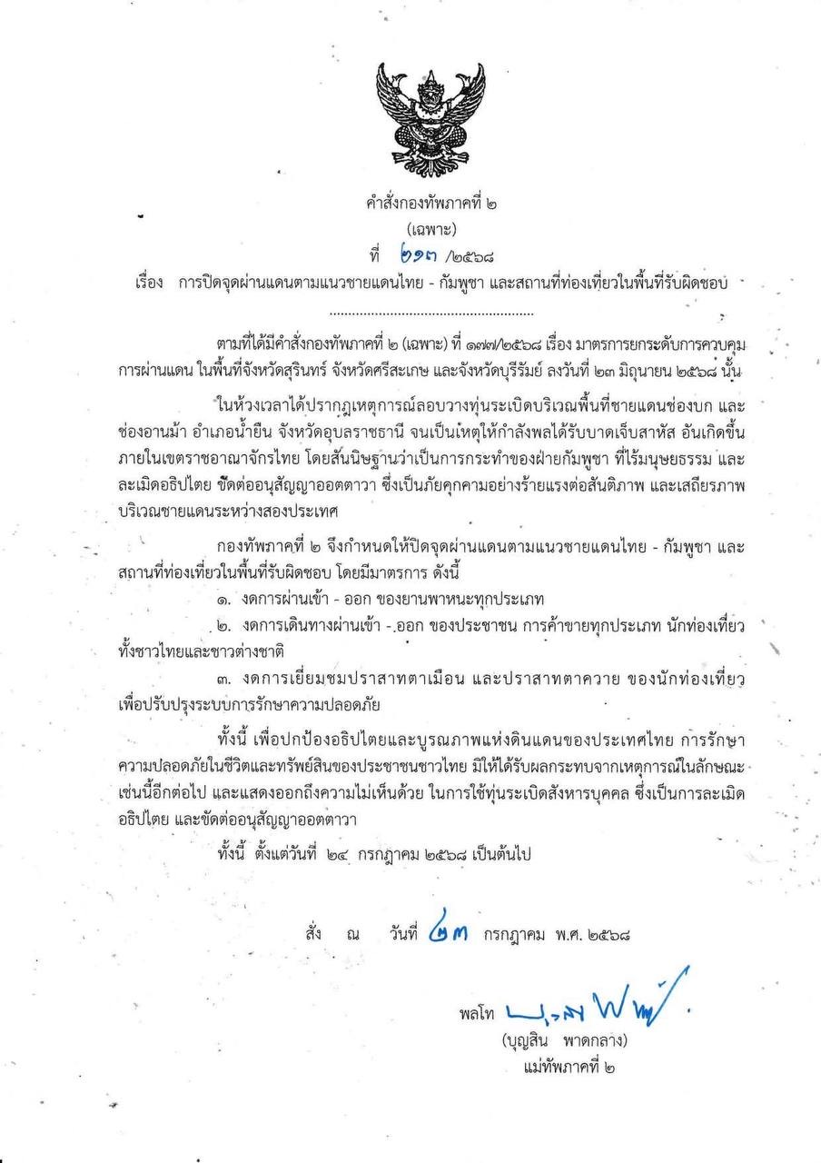 ប្រទេសថៃ ៖ នៅថ្ងៃទី២៣ ខែកក្កដា ឆ្នាំ២០២៥ មេបញ្ជាការយោធភូមិភាគទី២ថៃ ចេញបញ្ជាបិទច្រកឆ្លងដែនកម្ពុជា-ថៃ និងទីកន្លែងទេសចរណ៍។