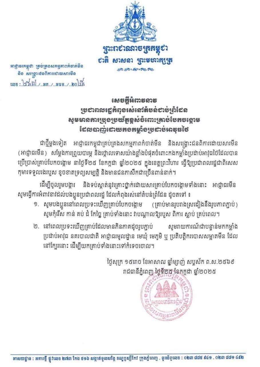 ភ្នំពេញ ៖ ជាថ្មីម្តងទៀត អាជ្ញាធរកម្ពុជាគ្រប់គ្រងសកម្មភាពកំចាត់មីន និងសង្គ្រោះជនពិការដោយសារមីន (អាជ្ញាធរមីន) សម្តែងការព្រួយបារម្ភ និងថ្កោលទោសយ៉ាងខ្លាំងបំផុតចំពោះកងកម្លាំងប្រដាប់អាវុធថៃដែលបាន ប្រើប្រាស់គ្រាប់បែកចង្កោម នាថ្ងៃទី២៥ ខែកក្កដា ឆ្នាំ២០២៥ ក្នុងខេត្តព្រះវិហារ ធ្វើឱ្យប្រជាពលរដ្ឋជាពិសេស កុមារទទួលរងរបួស ខូចខាតទ្រព្យសម្បត្តិ និងមានជនភាសឹកជាច្រើនពាន់នាក់។