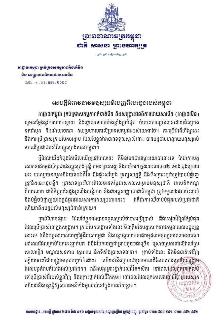 ភ្នំពេញ : អាជ្ញាធរកម្ពុជា គ្រប់គ្រងសកម្មភាពកំចាត់មីន និងសង្រ្គោះជនពិការដោយសារមីន (អាជ្ញាធរមីន) បានសម្តែង នូវការសោកស្តាយ និងថ្កោលទោសយ៉ាងខ្លាំងក្លាបំផុតចំពោះការឈ្លានពានដោយឥតព្រាងទុកជាមុន និងដោយ ចេតនា វាយប្រហារមកលើប្រទេសកម្ពុជារបស់យោធាថៃ។ ការប្រើអំពើហិង្សានេះនិងការប្រើប្រាស់គ្រាប់បែក ចង្កោមដែលថៃខ្លួនឯងបានទទួលស្គាល់នោះ បានបង្កជាមហន្តរាយមនុស្សធម៌មកលើប្រជាជនស៊ីវិលស្លូតត្រង់ របស់កម្ពុជា។ នេះបើយោងតាមសេចក្តីអំពាវនាវរបស់អាជ្ញាធរមីនចុះថ្ងៃទី២៧ ខែកក្កដា ឆ្នាំ២០២៥។