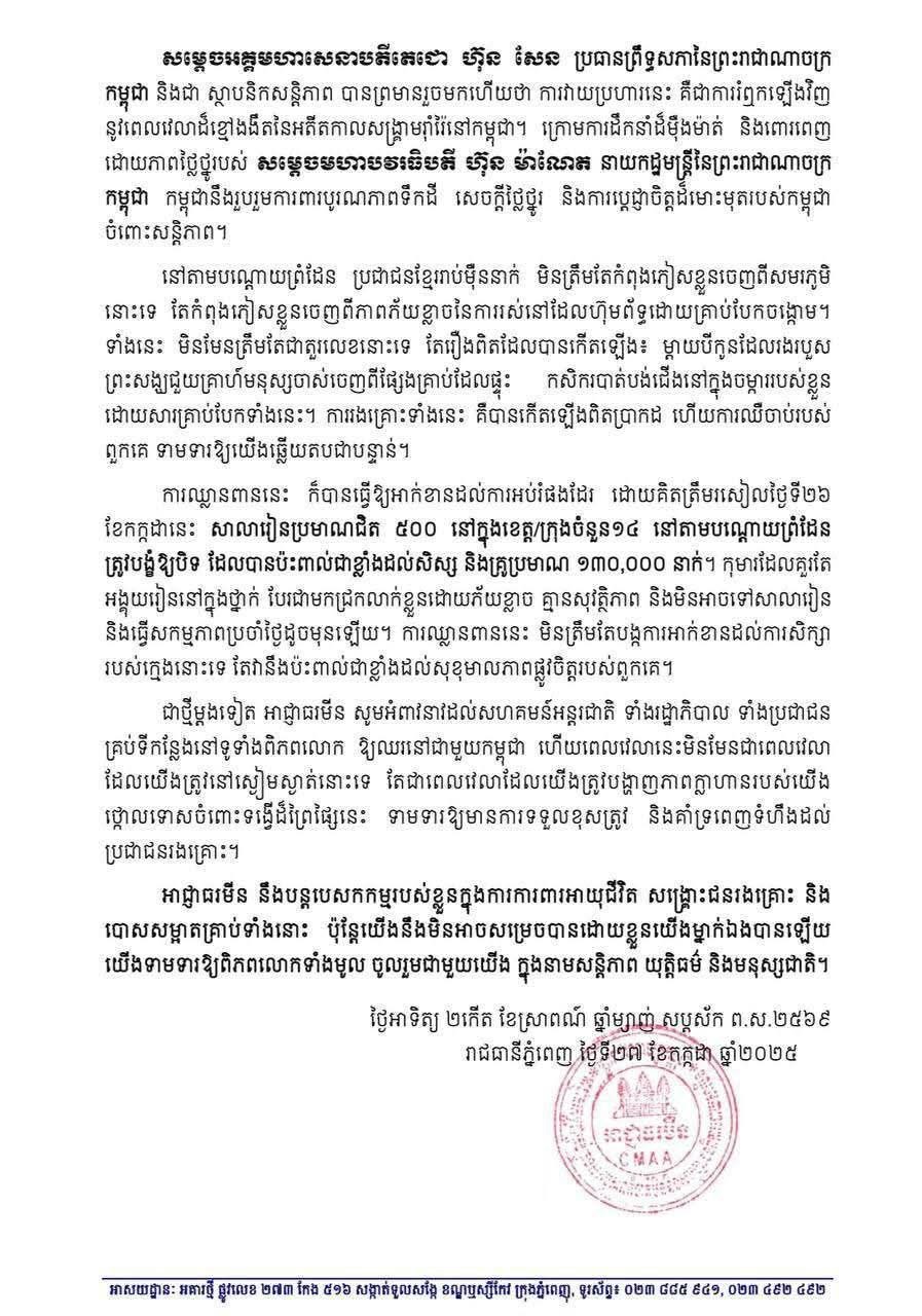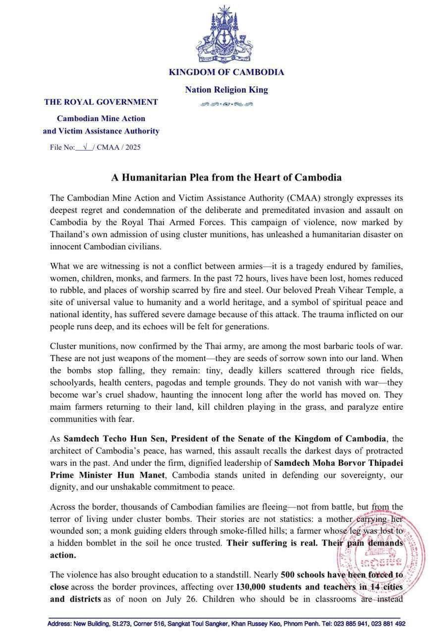 នៅក្នុងលិខិតអំពាវនាវនោះ បានបន្តថា អ្វីដែលយើងកំពុងតែមើលឃើញនៅពេលនេះ គឺមិនមែនជាជម្លោះយោធានោះទេ តែជាការបង្ក សោកនាដកម្មដល់ប្រជាជនស្លូតត្រង់ ស្ត្រី កុមារ ព្រះសង្ឃ និងកសិករ។ ក្នុងរយៈពេល ៧២ ម៉ោង ចុងក្រោយនេះ មនុស្សបានរបួសនិងបាត់បង់ជីវិត និងផ្ទះសម្បែង ទ្រព្យសម្បត្តិ និងទីសក្ការៈបូជាត្រូវបានបំផ្លាញ ត្រូវនិងឆេះខ្ទេចខ្ទី។ ប្រាសាទព្រះវិហារដែលមានតម្លៃជាសកលសម្រាប់មនុស្សជាតិ ជាបេតិកភណ្ឌ ពិភពលោក ជានិមិត្តរូបនៃដួងព្រលឹងសន្តិភាព និងជាអត្តសញ្ញាណជាតិកម្ពុជា ត្រូវទទួលរងផលប៉ះពាល់ និងបំផ្លិចបំផ្លាញយ៉ាងធ្ងន់ធ្ងរដោយសារការវាយប្រហារនេះ។ វាគឺជាការឈឺចាប់បំផុតរបស់ប្រជាជាតិ ហើយវានឹងបន្តដល់មនុស្សជំនាន់ក្រោយ។