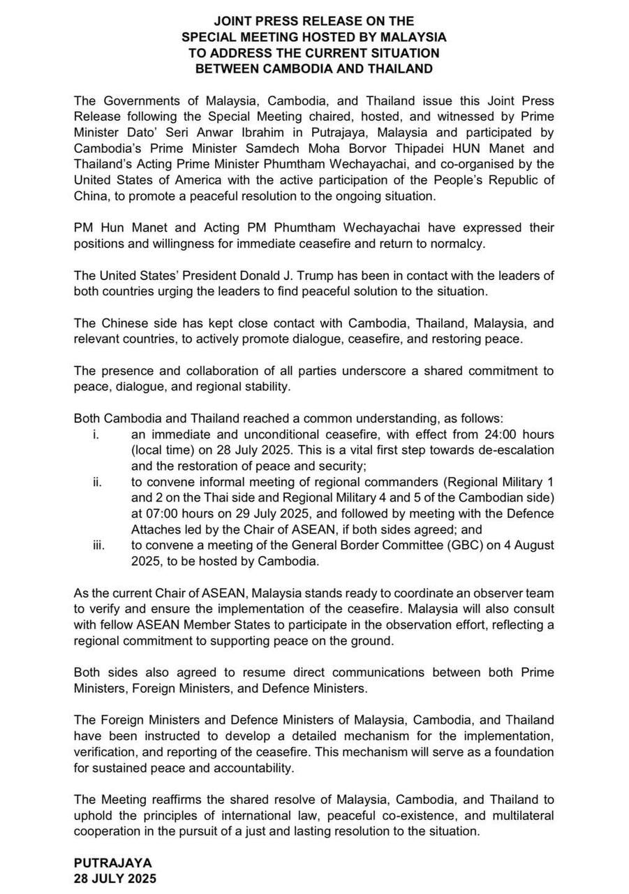 បទឈប់បាញ់នេះ ត្រូវបានឯកភាពគ្នា ក្នុងកិច្ចប្រជុំបន្ទាន់នៅប្រទេសម៉ាឡេស៊ី នារសៀលថ្ងៃទី២៨ ខែកក្កដា ឆ្នាំ២០២៥នេះ រវាងមេដឹកនាំកម្ពុជា សម្តេចបវរធិបតី ហ៊ុន ម៉ាណែត និង នាយករដ្ឋមន្រ្តីស្តីទីថៃ លោក Phumtham Wechayachai ក្រោមការសម្របសម្រួលរបស់ លោក អានវ៉ា អ៉ីប្រាហ៉ីម នាយករដ្ឋមន្រ្តីម៉ាឡេស៊ី ហើយដោយមានការចូលរួមជាសាក្សីពីតំណាងសហរដ្ឋអាមេរិក និងចិន៕