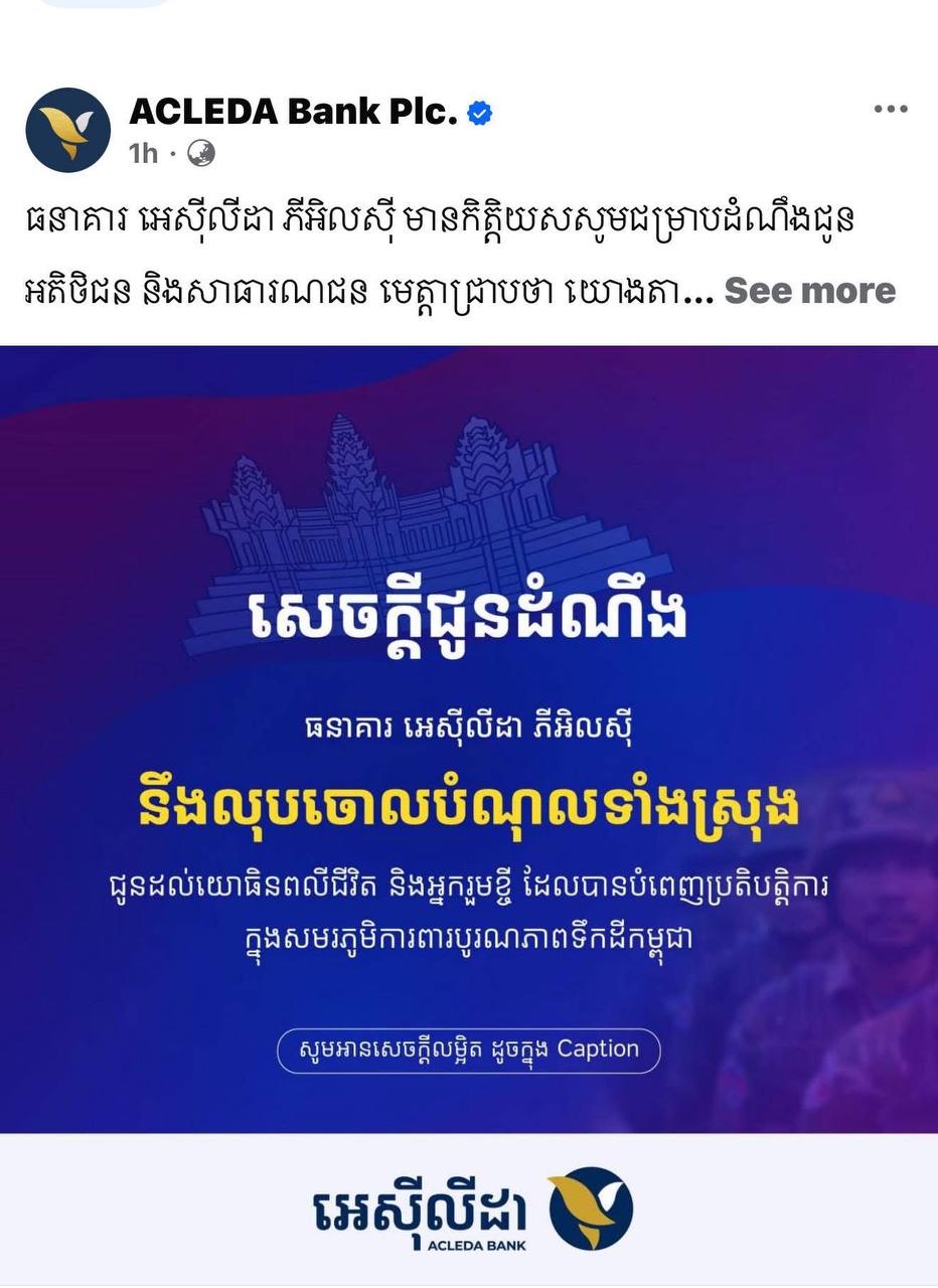 សម្តេចតេជោ សូមអរគុណ ធនាគារ អេស៊ីលីដា ភីអិលស៊ី ( ACLEDA Bank Plc.) ដែលបានសម្រេចលុបចោលបំណុលទាំងស្រុង ជូនដល់យោធិនពលីជីវិត និងអ្នករួមខ្ចី ដែលបានបំពេញប្រតិបត្តិការក្នុងសមរភូមិការពារបូរណភាពទឹកដីកម្ពុជា
