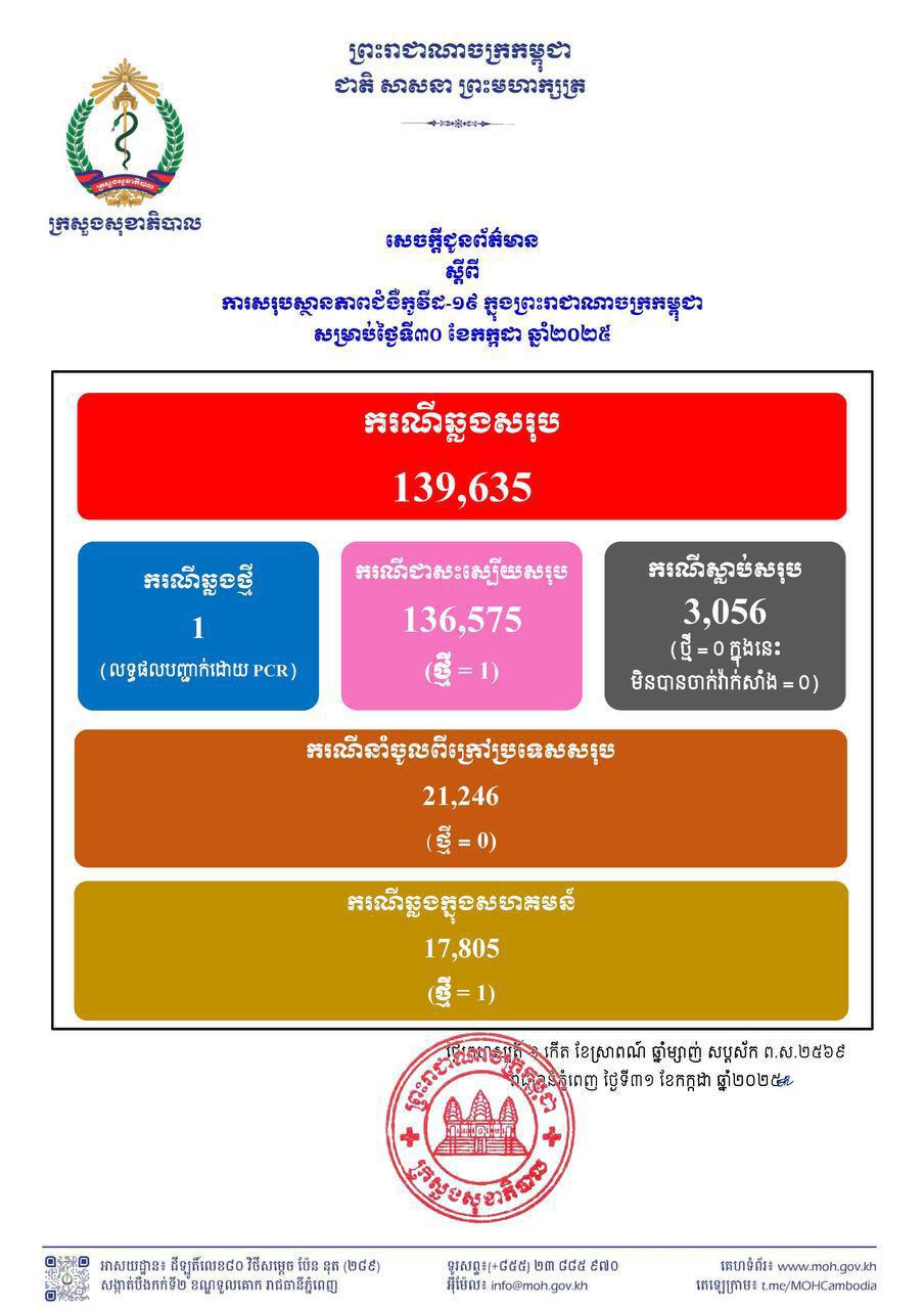 សូមជម្រាបថា នៅក្នុងសេចក្ដីជូនដំណឹងរបស់ក្រសួងសុខាភិបាល នៅថ្ងៃទី៣០ ខែកក្កដា ឆ្នាំ២០២៥ មានអ្នកឆ្លងថ្មី ០១នាក់, មានអ្នកជាសះស្បើយ ០១នាក់ , និងអ្នកជំងឺស្លាប់គ្មាន៖