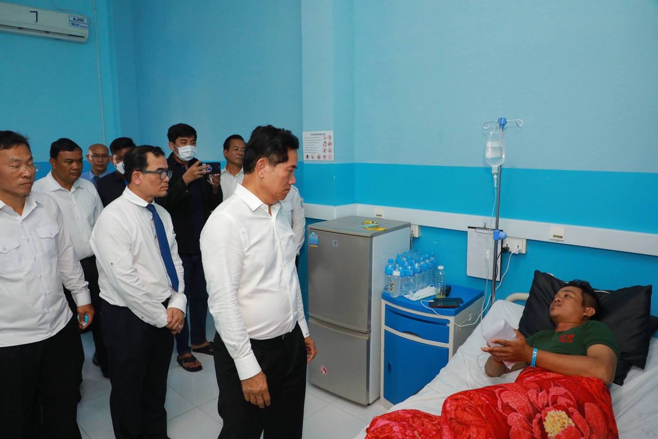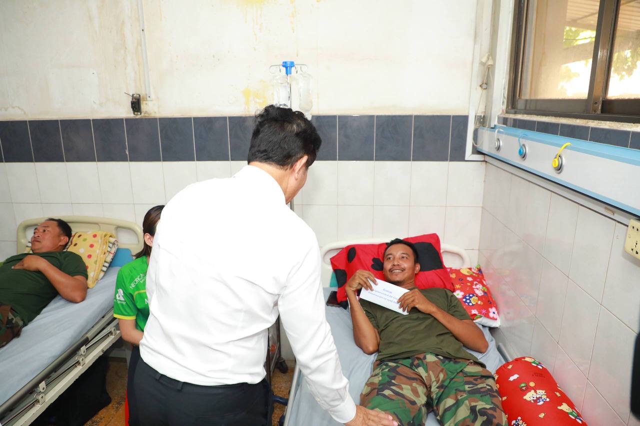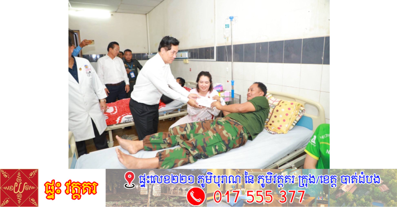 ភ្នំពេញ៖.គណៈប្រតិភូរដ្ឋបាលរាជធានីភ្នំពេញ ដឹកនាំដោយ.លោក ឃួង ស្រេង អភិបាលរាជធានីភ្នំពេញ បានចុះសួរសុខទុក្ខព្រមទាំងនាំយកអំណោយដ៏ថ្លៃថ្លារបស់សម្តេចមហាបវរធិបតី ហ៊ុន ម៉ាណែត នាយករដ្ឋមន្ត្រី នៃព្រះរាជាណាចក្រកម្ពុជា និងលោកជំទាវ បណ្ឌិត ពេជ ចន្ទមុន្នី ហ៊ុន ម៉ាណែត ជូនកងទ័ពជួរមុខដែលកំពុងសម្រាកព្យាបាលរបួស ដោយសង្គ្រាមពីកងទ័ពថៃ ក្នុងម្នាក់ៗ ទទួលបានថវិកា ៤លានរៀល