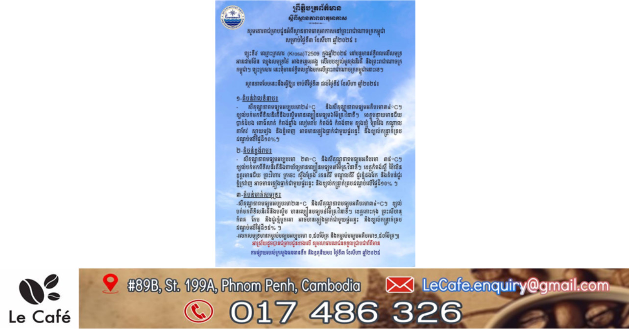 សូមគោរពជម្រាបជូនអំពីស្ថានភាពធាតុអាកាសនៅព្រះរាជាណាចក្រកម្ពុជា សម្រាប់ថ្ងៃទី៣ ខែសីហា ឆ្នាំ២០២៥ ៖