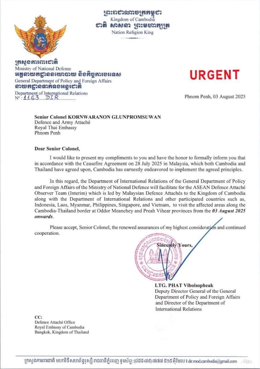 The Department of International Relations of the Ministry of National Defence has formally informed the Defence Attaché of Thailand to the Kingdom of Cambodia, regarding the facilitation for the ASEAN Defence Attache Observer Team (Interim) led by the Malaysian Defence Attache and the Department of International Relations as well as other participated countries, to visit the affected areas along the border at Oddar Meanchey and Preah Vihear provinces from 03 August 2025 onwards.៕