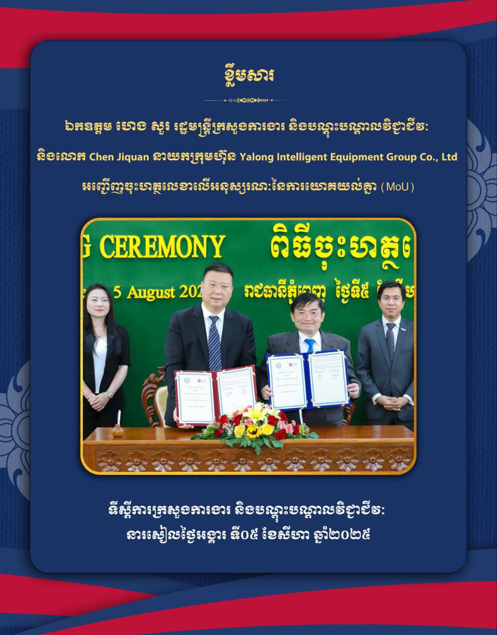 ពិធីចុះហត្ថលេខានេះ ធ្វើឡើងក្រោមអធិបតីភាពដ៏ខ្ពង់ខ្ពស់ លោក ហេង សួរ រដ្ឋមន្រ្តីក្រសួងការងារ និងបណ្ដុះបណ្ដាលវិជ្ជាជីវៈ និងលោក CHEN Jiquan នាយកក្រុមហ៊ុន Yalong Intelligent Equipment Group Co., Ltd នៅទីស្តីការក្រសួង នារសៀលថ្ងៃអង្គារ ទី០៥ ខែសីហា ឆ្នាំ២០២៥។