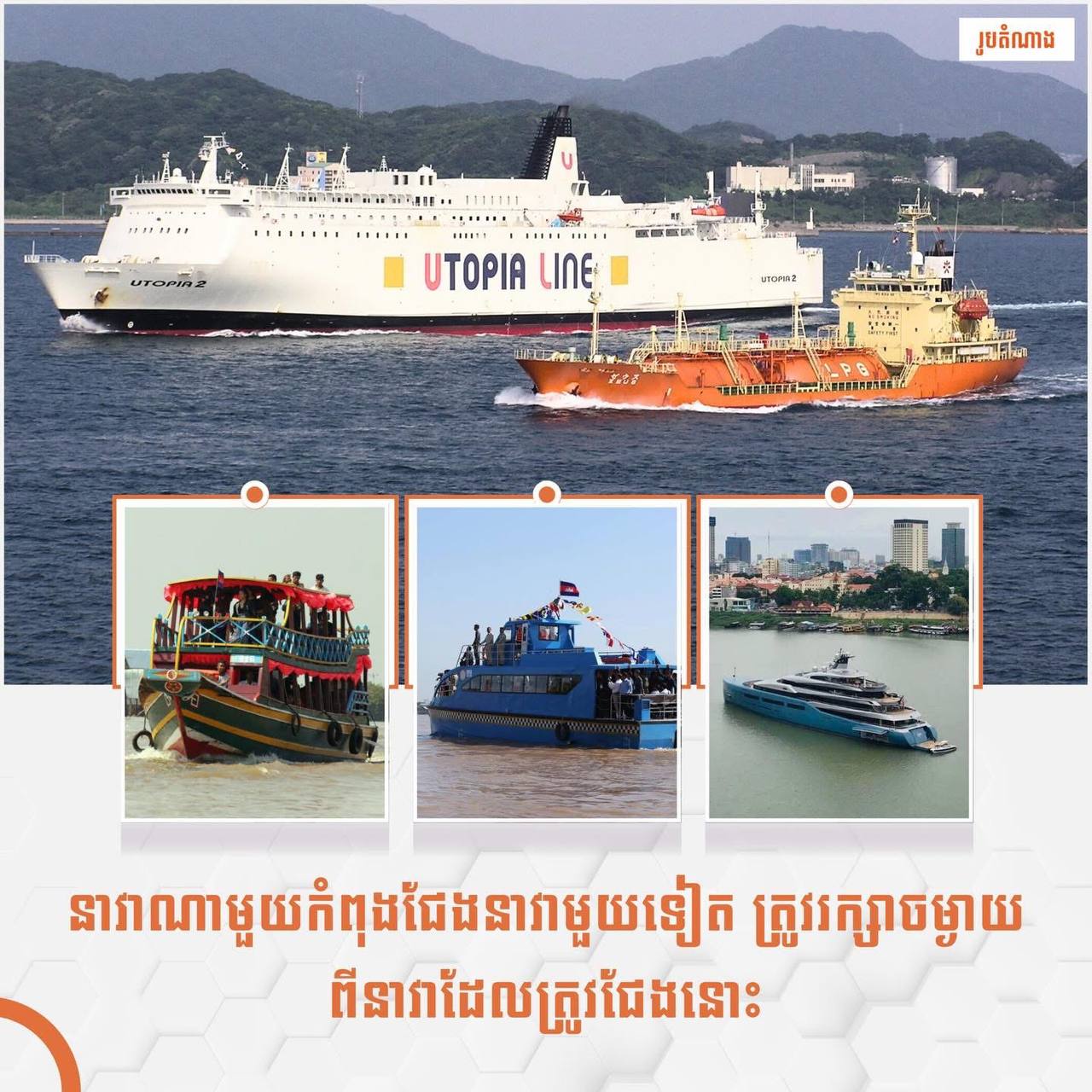 ភ្នំពេញ៖ ក្រសួងសាធារណការ និងដឹកជញ្ជូន នៅថ្ងៃទី០៧ ខែសីហា ឆ្នាំ២០២៥នេះ បានឱ្យដឹងថា យោងតាមច្បាប់ ស្តីពីការដឹកជញ្ជូនតាមផ្លូវទឹក មាត្រា៨៩ បានចែងថា ៖ នាវាណាមួយកំពុងជែងនាវាមួយទៀត ត្រូវរក្សាចម្ងាយពីនាវាដែលត្រូវជែងនោះ។