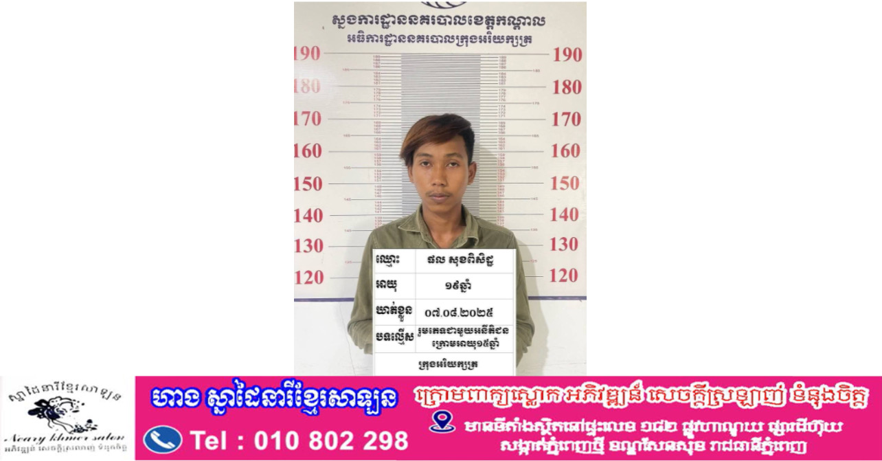 លោកវរសេនីយ៏ទោ រស់ បាលីន អធិការនគរបាលក្រុងអរិយក្សត្របានឱ្យដឹងថា ដើមបណ្តឹងឈ្មោះ ឃន សុភឿន ភេទស្រីអាយុ៤៨ឆ្នាំ ជនជាតិខ្មែរ មុខរបរ តម្បាញ មានទីលំនៅក្នុងភូមិពុកឬស្សីក្រោម ឃុំពុកឬស្សី ស្រុកខ្សាច់កណ្តាល ខេត្តកណ្តាល ត្រូវជាម្តាយបង្កើតរបស់ ក្មេងស្រីរងគ្រោះ អាយុ១៤ឆ្នាំ ជនជាតិខ្មែរ ស្ថិតនៅ ក្នុងបន្ទុកគ្រួសារ ។ ចំនែកបុរសជាជនសង្ស័យមានឈ្មោះ ផល សុខពិសិដ្ឋ អាយុ១៩ឆ្នាំ ជនជាតិខ្មែរ មុខរបរ ជាង ម៉ាស៊ីនត្រជាក់ មានទីលំនៅក្នុងភូមិព្រែកបង្កង សង្កាត់ព្រែកតាកូវ ក្រុងអរិយក្សត្រ ខេត្តកណ្តាល ។ វត្ថុតាងដកហូត ទូរស័ព្ទម៉ាក Iphone ចំនួន ០១គ្រឿង ។