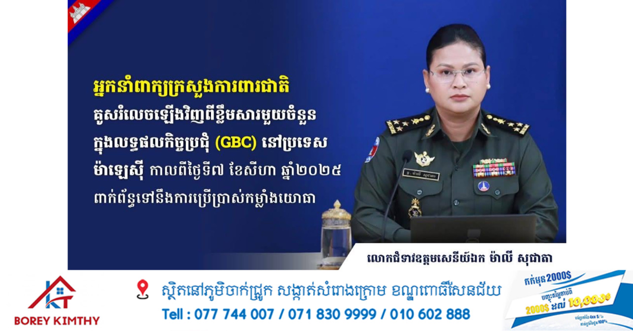 ភ្នំពេញ ៖ ថ្លែងក្នុងសេចក្តីសង្ខេបព័ត៌មានប្រចាំថ្ងៃស្តីពី «លទ្ធផលនៃការអនុវត្តបទឈប់បាញ់រវាងកម្ពុជា-ថៃ» នៅម៉ោង៤រសៀលថ្ងៃទី៩ ខែសីហា ឆ្នាំ២០២៥ លោកស្រីឧត្តមសេនីយ៍ឯក ម៉ាលី សុជាតា អ្នកនាំពាក្យក្រសួងការពារជាតិ បានរំលឹកឡើងវិញពីខ្លឹមសារមួយចំនួនដែលមានចែងនៅក្នុងសេចក្តីប្រកាសព័ត៌មានរួមនៃកិច្ចប្រជុំវិសាមញ្ញនៃគណៈកម្មាធិការព្រំដែនទូទៅកម្ពុជា-ថៃ (GBC) នៅទីក្រុងគូឡាឡាំពួរ ប្រទេសម៉ាឡេស៊ី កាលពីថ្ងៃទី៧ ខែសីហា ឆ្នាំ២០២៥ ពាក់ព័ន្ធទៅនឹងការប្រើប្រាស់កម្លាំងយោធា ដែលមានខ្លឹមសារដូចខាងក្រោម៖