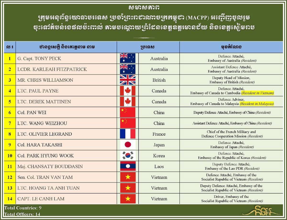 ភ្នំពេញ ៖ នៅថ្ងៃអាទិត្យទី១០ ខែសីហា ឆ្នាំ២០២៥នេះ ក្រុមអនុព័ន្ធយោធាបរទេសប្រចាំព្រះរាជាណាចក្រកម្ពុជា (MACPP) ដែលមាននិវេសន្នដ្ឋានស្ថិតក្នុង និងក្រៅប្រទេសកម្ពុជា បានចេញដំណើរពីរាជធានីភ្នំពេញ ឆ្ពោះទៅខេត្តឧត្តរមានជ័យ ដើម្បីពិនិត្យស្ថានភាពជាក់ស្តែង និងទីតាំងស្នាក់នៅរបស់ជនភៀសសឹក ក្រោយកម្ពុជាចូលរួមអនុវត្តបទឈប់បាញ់យ៉ាងពេញលេញ ដោយមានវត្តមានមកពីប្រទេសចំនួន០៩ និង១៤រូបបានចូលរួម ក្នុងនោះរួមមាន ប្រទេស អូស្ត្រាលី ចក្រភពអង់គ្លេស កាណាដា ចិន បារាំង ជប៉ុន កូរ៉េខាងត្បូង ឡាវ និងវៀតណាម។