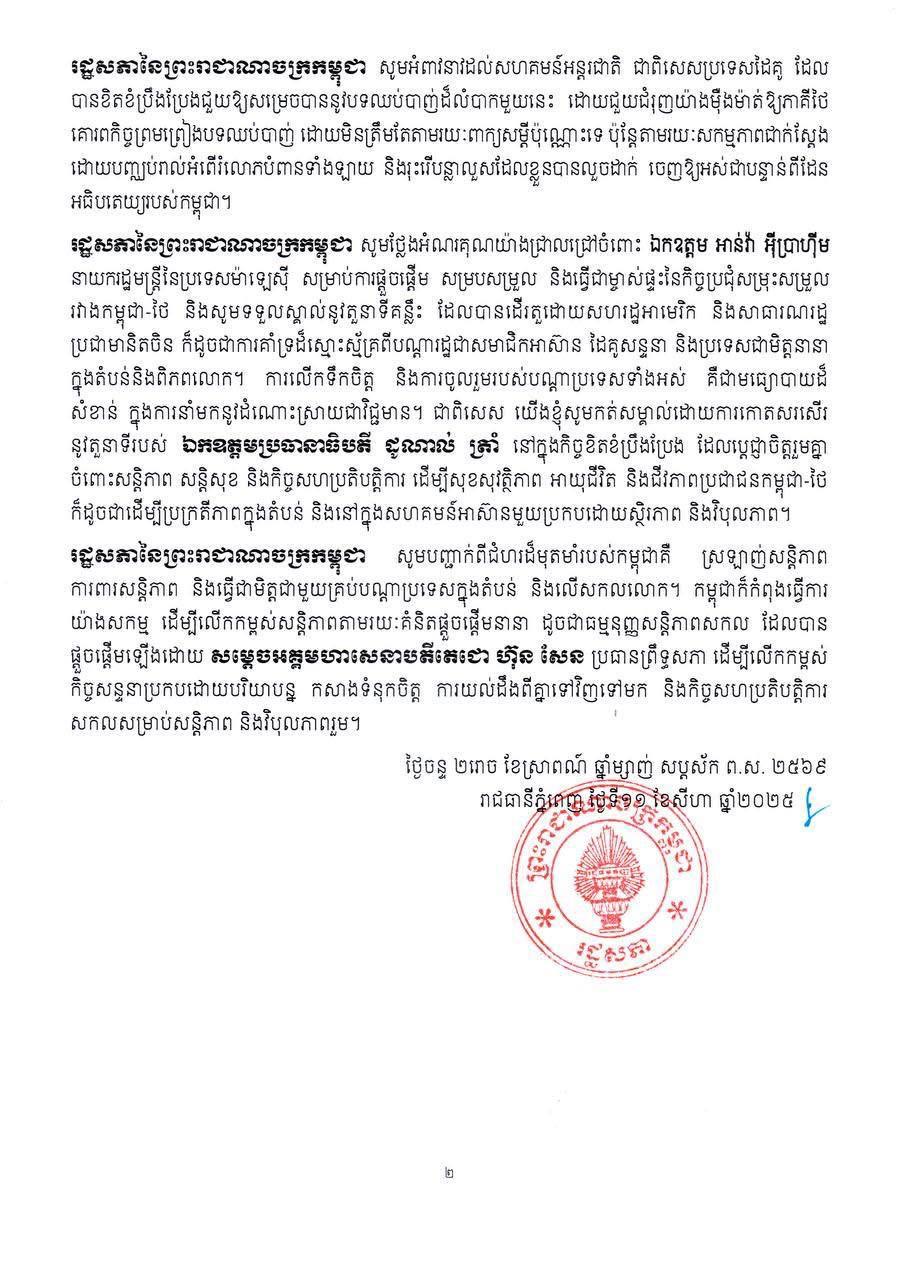 ភ្នំពេញ ៖ សេចក្តីថ្លែងការណ៍ រដ្ឋសភានៃព្រះរាជាណាចក្រកម្ពុជា សម្តែងនូវការខកចិត្តយ៉ាងខ្លាំង ចំពោះការប្រកាសគាំទ្ររបស់ ឯកឧត្តម វ៉ាន់មូហាម៉ាត់ ណ័រ មៈថា ប្រធានសភាតំណាងរាស្ត្រ និងជាប្រធានរដ្ឋសភាថៃ ចំពោះលោកឧត្តមសេនីយ៍ឯក ប៊ុនស៊ីន ផាត់ឃ្លាំង មេបញ្ជាការយោធភូមិភាគទី២ របស់ថៃ ដែលបានចុះផ្សាយជាភាសាថៃនៅក្នុងគេហទំព័រ រដ្ឋសភានៃព្រះរាជាណាចក្រថៃ និងកាសែត The Nation កាលពីថ្ងៃទី១០ ខែសីហា ឆ្នាំ២០២៥ កន្លងទៅ ដែលលោកឧត្តមសេនីយ៍ឯក ប៊ុនស៊ីន ផាត់ឃ្លាំង បានប្រកាសពីផែនការមុនចូលនិវត្តន៍របស់ខ្លួន ដែលនៅសល់ ៥១ ថ្ងៃទៀតដោយ ទី១) ដណ្តើមកាន់កាប់ប្រាសាទតាក្របី ពីការគ្រប់គ្រងដោយស្របច្បាប់របស់កម្ពុជា ទី២) ប្រកាសបិទប្រាសាទតាមាន់ធំដែលស្ថិតក្នុងដែនអធិបតេយ្យ និងបូរណភាពទឹកដីកម្ពុជា។