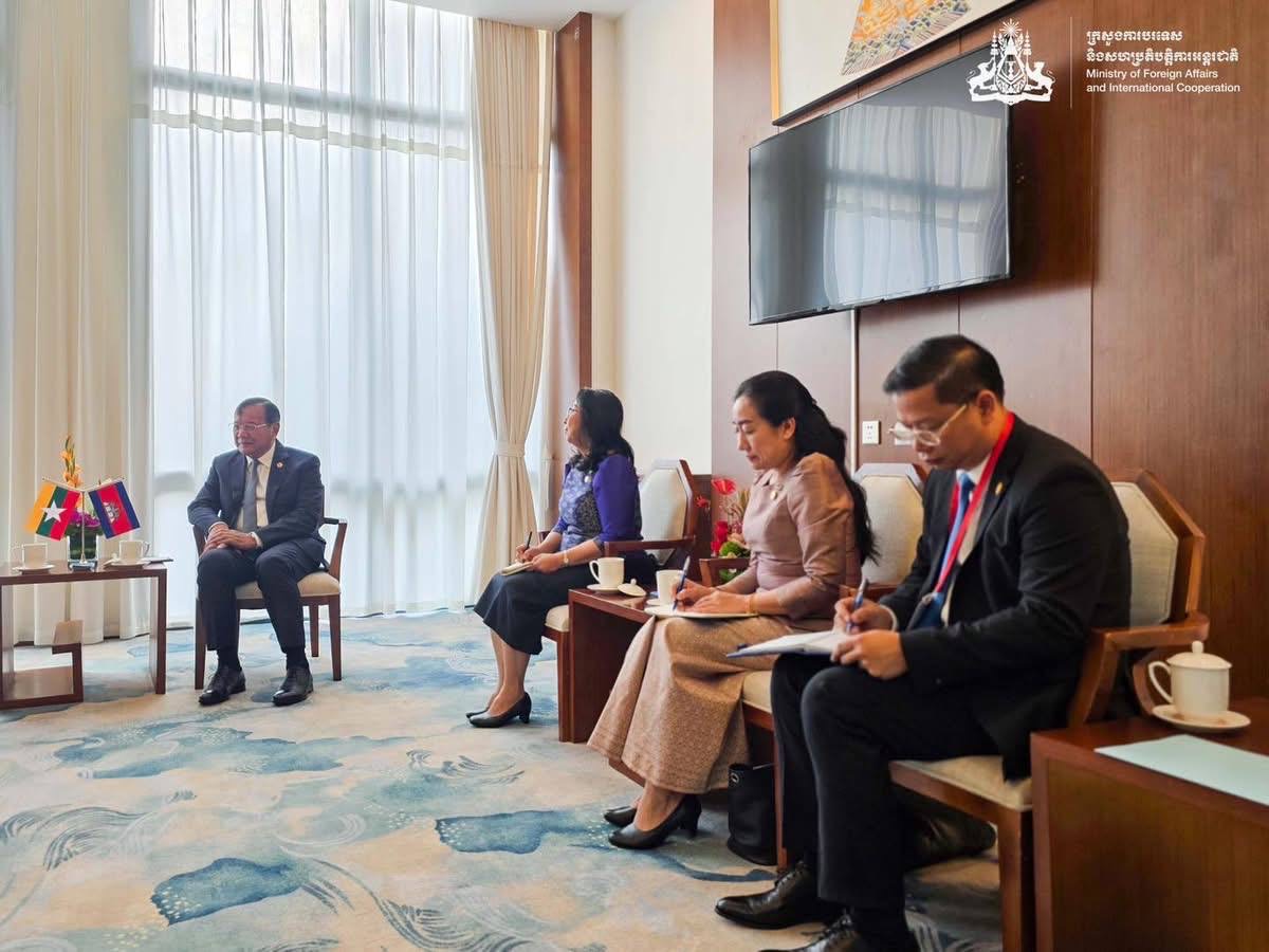ទីក្រុងប៉េកាំង ៖ នៅល្ងាចថ្ងៃទី១៤ ខែសីហា ឆ្នាំ២០២៥ លោក ប្រាក់ សុខុន ឧបនាយករដ្ឋមន្ត្រី រដ្ឋមន្ត្រីការបរទេស និងសហប្រតិបត្តិការអន្តរជាតិ បានអញ្ជើញជួបពិភាក្សាការងារទ្វេភាគីជាមួយ លោក U Than Swe ឧបនាយករដ្ឋមន្ត្រី រដ្ឋមន្ត្រីក្រសួងការបរទេស នៃសាធារណរដ្ឋសហភាពមីយ៉ាន់ម៉ា ក្នុងឱកាសកិច្ចប្រជុំរដ្ឋមន្ត្រីការបរទេសនៃកិច្ចសហប្រតិបត្តិការមេគង្គ-ឡានឆាង លើកទី១០ នៅទីក្រុងអាននីង ខេត្តយូណាន ប្រទេសចិន។