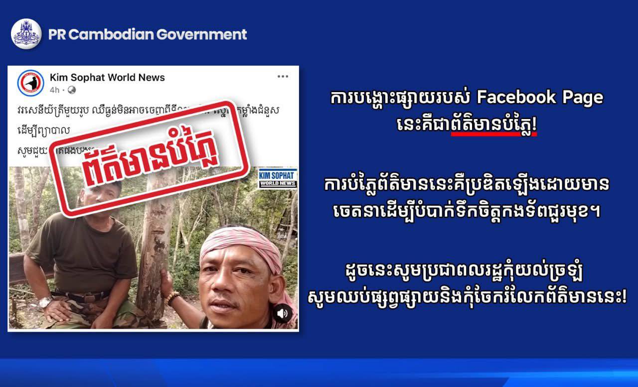 ភ្នំពេញ ៖ យោងតាមការបង្ហោះផ្សាយនៅលើបណ្តាញសង្គមរបស់ PR Cambodian Government នៅរសៀលថ្ងៃទី១៥ ខែសីហា ឆ្នាំ២០២៥ បានឱ្យដឹងថា ការបង្ហោះផ្សាយរបស់ Facebook Page ដូចមានភ្ជាប់មកជាមូយនេះគឺជាព័ត៌មានបំភ្លៃការពិត ប្រឌិតឡើងដោយមានចេតនា ដើម្បីបំបាក់ទឹកចិត្តកងទ័ពជួរមុខ។