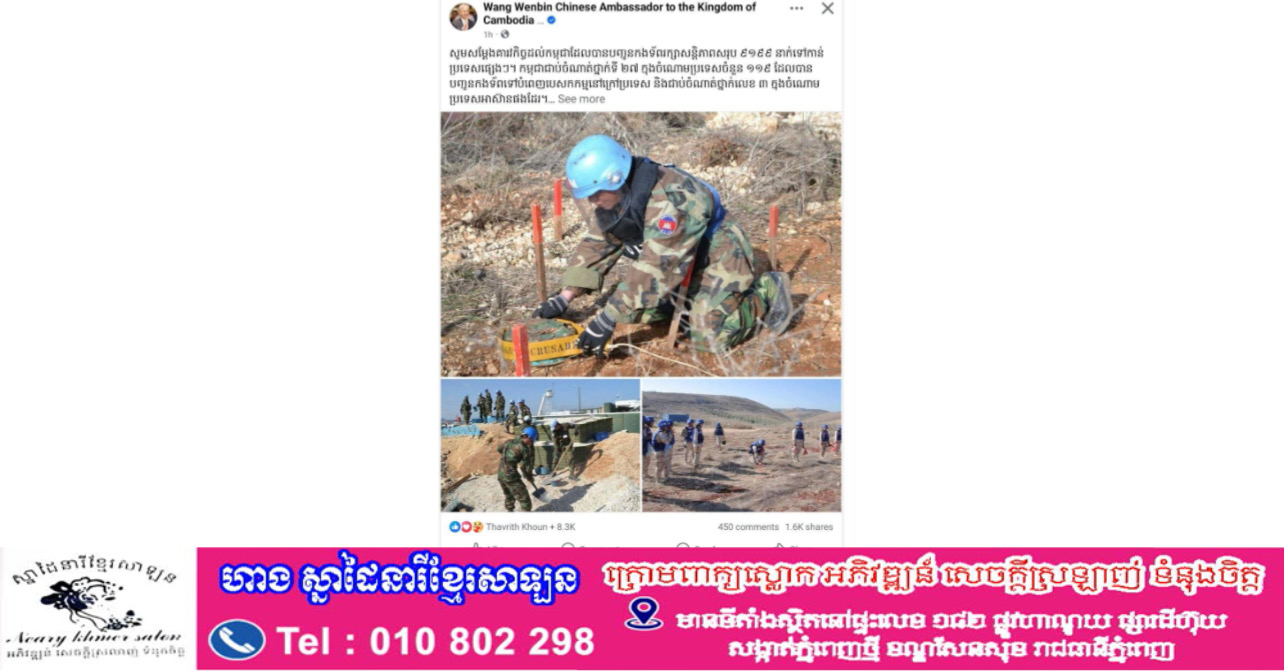ភ្នំពេញ៖ លោក Wang Wenbin ឯកអគ្គរដ្ឋទូតចិនប្រចាំកម្ពុជា នថ្ងៃទី១៨ ខែសីហា ឆ្នាំ២០២៥ បានសម្តែងនូវការកោតសរសើរចំពោះការចូលរួមរបស់កម្ពុជា ដែលបានបញ្ជូនកងទ័ពរក្សាសន្តិភាព ក្រោមឆ័ត្រអង្គការសហប្រជាជាតិ (UN)។