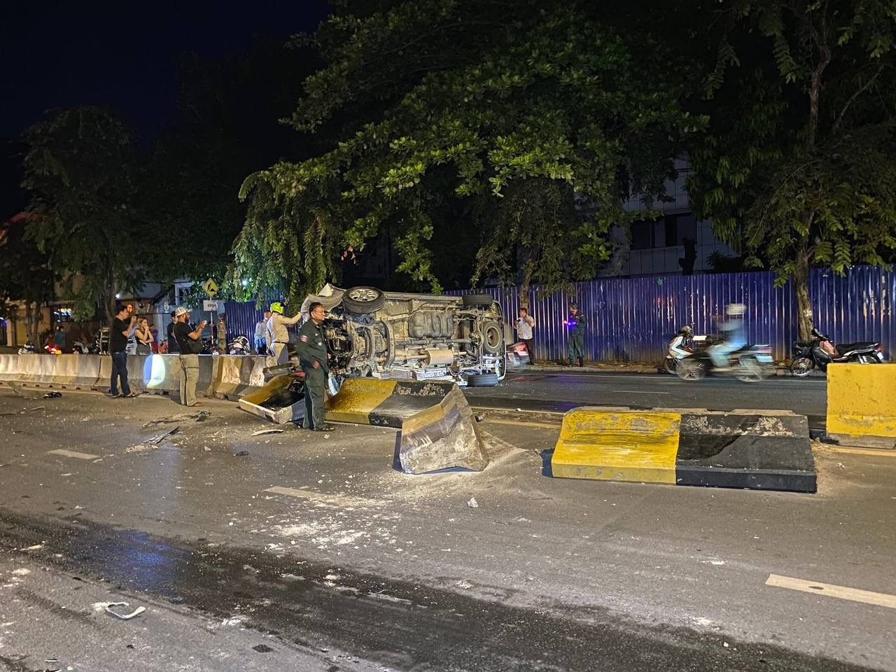 ភ្នំពេញ៖រថយន្តម៉ាកហ៉ីយ៉ាន់ដាយ ស្តារិច បេីកបរដោយបុរសជនជាតិចិនក្នុងស្ថានភាពស្រវឹងក៏ជ្រុលទៅបុកនិងរបាំងថ្មពុះចែកផ្លូវបណ្ដាលឱ្យរថយន្តក្រឡាប់រងការខូចខាតយ៉ាងដំណំ ។