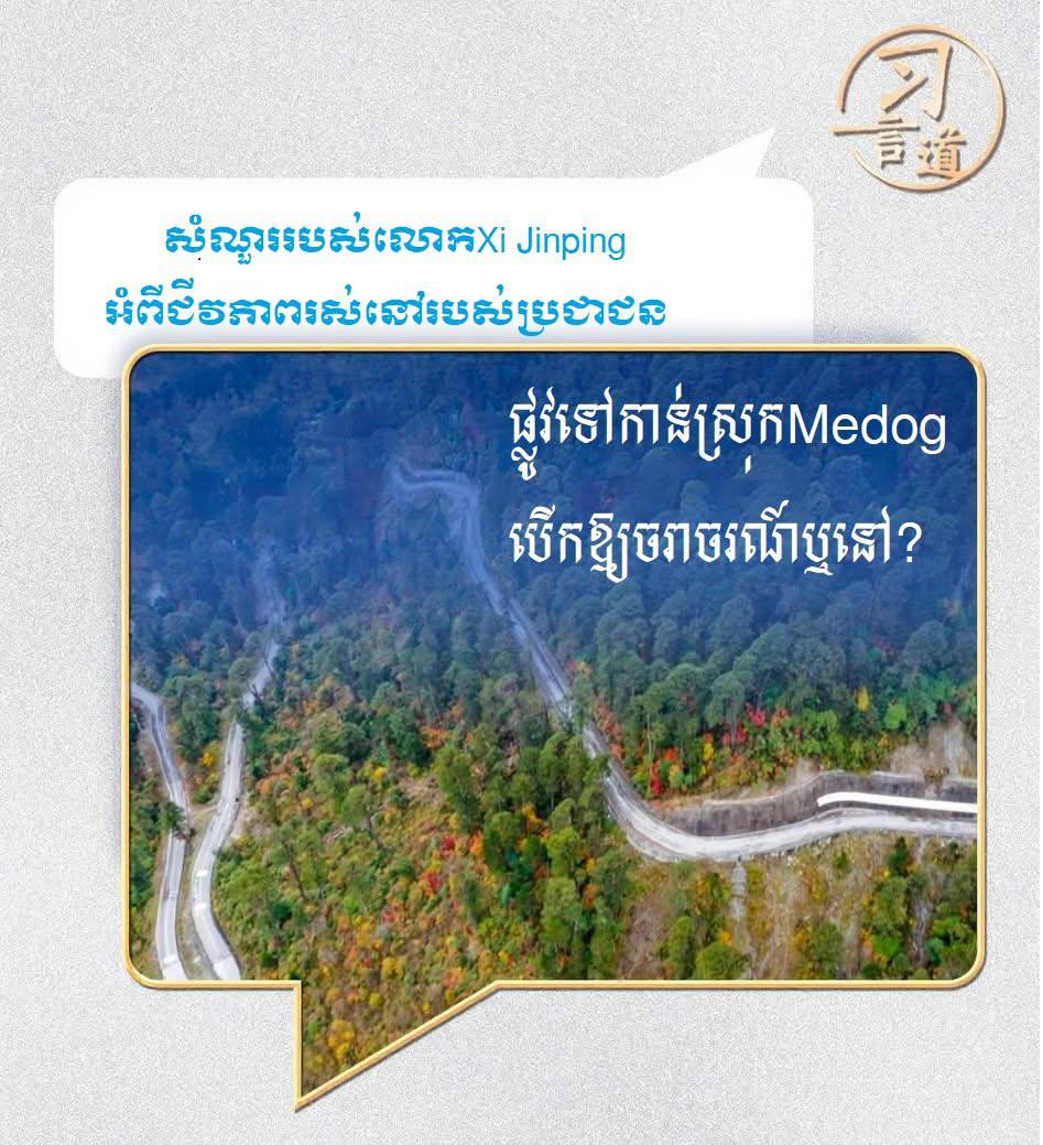 ស្រុក Medog ដែលមានទីតាំងនៅ ជ្រុងភាគអាគ្នេយ៍នៃខ្ពង់រាបQinghai-Xizang ធ្លាប់ ជាស្រុកតែមួយគត់ នៅក្នុងប្រទេសចិន ដែលគ្មានផ្លូវធ្វើដំណើរ។ ជាច្រើន ជំនាន់មក ហើយ ប្រជាជន នៅស្រុក Medog ចង់បាន ផ្លូវ ហើយតើផ្លូវទៅកាន់ ស្រុក Medog ធ្វើរួចរាល់ឬនៅបាន ក្លាយ ជាកង្វល់ យ៉ាងជ្រាលជ្រៅ សម្រាប់ លោក Xi Jinping។