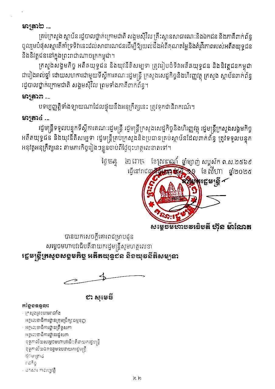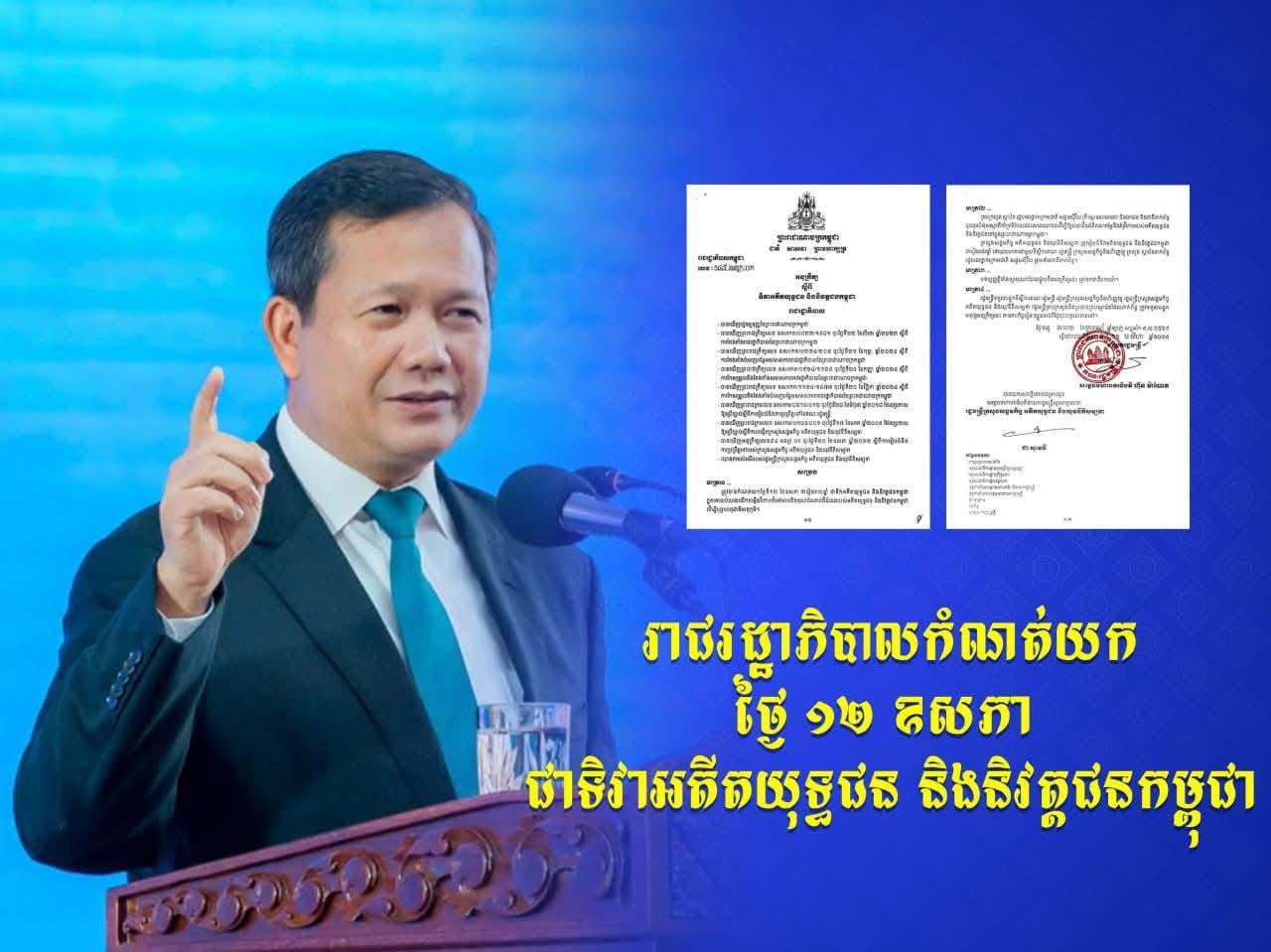 ភ្នំពេញ ៖ រាជរដ្ឋាភិបាលកម្ពុជា បានសម្រេចកំណត់យកថ្ងៃទី១២ ខែឧសភា ជារៀងរាល់ឆ្នាំ ជាទិវាអតីតយុទ្ធជន និងនិវត្តជនកម្ពុជា ក្នុងគោលបំណងលើកតម្កើងនូវវីរភាពដ៏អង់អាច និងគុណបំណាច់ដ៏ធំធេងរបស់អតីតយុទ្ធជន និងនិវត្តជនកម្ពុជា ដើម្បីបុព្វហេតុជាតិ មាតុភូមិ។ នេះបើយោងតាមអនុក្រឹត្យ ដែលអង្គភាព មជ្ឈមណ្ឌលព័ត៌មាន «នគរវត្ត» នារសៀលថ្ងៃទី២១ ខែសីហា ដ ហើយចេញដោយ រាជរដ្ឋាភិបាលកម្ពុជាក្រោមការដឹកនាំរបស់សម្ដេចមហាបវរធិបតី ហ៊ុន ម៉ាណែត នាយករដ្ឋមន្រ្តី នាថ្ងៃទី១១ ខែសីហា ឆ្នាំ២០២៥។