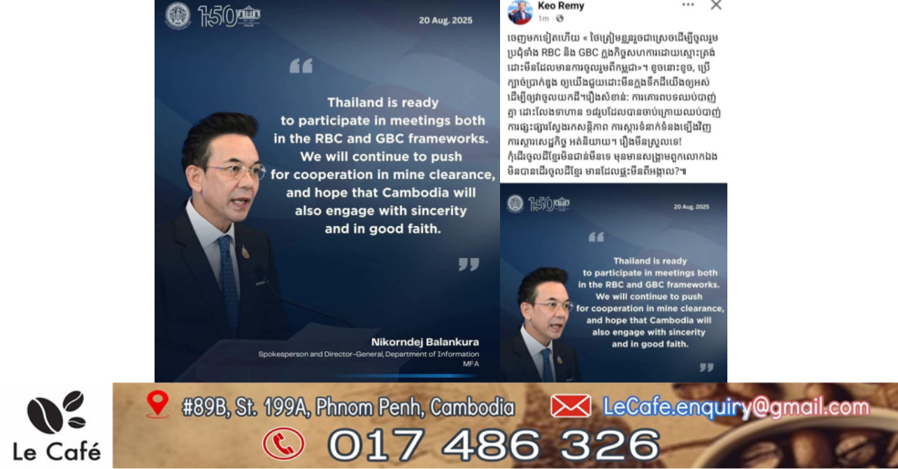 ភ្នំពេញ : នៅល្ងាចថ្ងៃទី២១ ខែសីហា ឆ្នាំ២០២៥ លោក កែវ រ៉េមី រដ្ឋមន្រ្តីប្រតិភូអមនាយករដ្ឋមន្រ្តី និងជាប្រធានគណៈកម្មាធិការសិទ្ធិមនុស្សកម្ពុជា បានបង្ហោះលើផេកលោកថា, ចេញមកទៀតហើយ « ថៃត្រៀមខ្លួនរួចជាស្រេចដើម្បីចូលរួមប្រជុំទាំង RBC និង GBC ក្នុងកិច្ចសហការដោយស្មោះត្រង់ដោះមីនដែលមានការចូលរួមពីកម្ពុជា»។ ខូចនោះខូច, ប្រើក្បាច់ប្រាក់ឌួង ឲ្យយើងជួយដោះមីនក្នុងទឹកដីយើងឲ្យអស់ដើម្បីឲ្យវាចូលយកដី។រឿងសំខាន់: ការគោរពបទឈប់បាញ់គ្នា ដោះលែងទាហាន ១៨រូបដែលបានចាប់ក្រោយឈប់បាញ់ ការផ្សះផ្សារស្វែងរកសន្តិភាព ការស្តារទំនាក់ទំនងឡើងវិញ ការស្តារសេដ្ឋកិច្ច អត់និយាយ។ រឿងមីនស្រួលទេ!