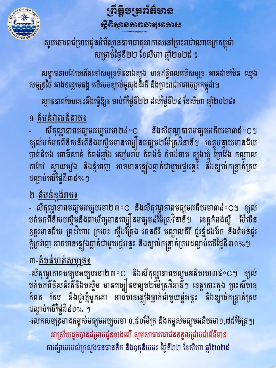 សូមគោរពជម្រាបជូនអំពីស្ថានភាពធាតុអាកាសនៅព្រះរាជាណាចក្រកម្ពុជា សម្រាប់ថ្ងៃទី២២ ខែសីហា ឆ្នាំ២០២៥ ៖