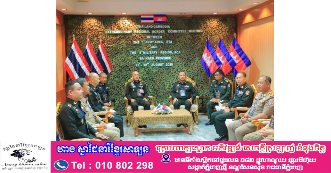 កម្ពុជា-ថៃ៖ លោកឧត្តមសេនីយ៍ឯក Amarit Boonsuya មេបញ្ជាការ កងទ័ពភូមិភាគទី១ និងលោកឧត្តមសេនីយ៍ឯក ឯក សំអូន មេបញ្ជាការយោធភូមិភាគទី៥ បញ្ជាក់ពីការប្តេជ្ញាចិត្តយ៉ាងមុតមាំ ក្នុងការអនុវត្តបទឈប់បាញ់ និងគោលការណ៍ឯកភាពទាំង១៣ចំណុច ការពង្រឹងបន្ថែមទៀតនូវទំនាក់ទំនងទ្វេភាគី និងការស្តារប្រក្រតីភាពឡើងវិញនៅតាមតំបន់ព្រំដែន។