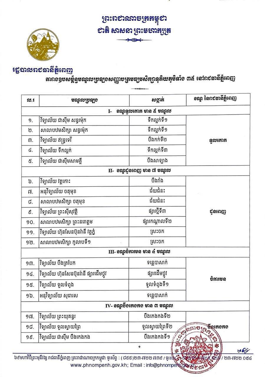 ភ្នំពេញ៖ រដ្ឋបាលរាជធានីភ្នំពេញ នៅថ្ងៃទី២៦ សីហា ២០២៥នេះបានជូនដំណឹង ដល់សាធា រណជនទាំងអស់ នៅក្នុងរាជធានីភ្នំពេញ មេត្តាជ្រាបថា ក្រសួងអប់រំ យុវជន និងកីឡា នឹងរៀបចំការប្រឡងសញ្ញាបត្រមធ្យមសិក្សាទុតិយភូមិ សម្រាប់ឆ្នាំសិក្សា ២០២៤- ២០២៥ សម័យប្រឡង ២៨-២៩ សីហាឆ្នាំ២០២៥។ ក្នុងន័យនេះ ដើម្បីចូលរួមចំណែកឱ្យដំណើរការប្រឡងសញ្ញាបត្រមធ្យមសិក្សាទុតិយភូមិ នៅរាជធានីភ្នំពេញ ប្រព្រឹត្តទៅដោយរលូន និងជោគជ័យ ជាពិសេសធានារក្សាបាននូវសន្តិសុខ សុវត្ថិភាព សណ្តាប់ធ្នាប់ តម្លា ភាព និង របៀបរៀបរយសាធារណៈនៅជុំវិញមណ្ឌលប្រឡងទាំង ៣៥មណ្ឌល ក្នុងរាជធានីភ្នំពេញ រដ្ឋបាលរាជធានីភ្នំពេញ សូមជូន ដំណឹងដល់បងប្អូនអាជីវករដែលប្រកបអាជីវកម្មជុំវិញបរិវេណមណ្ឌលប្រឡង (ដូចមានក្នុងឯកសារឧបសម្ព័ន្ធ)ដូចខាងក្រោម៖ ទី,១- ផ្អាកជាបណ្តោះអាសន្នចំពោះទីតាំងអាជីវកម្មថតចម្លងឯកសារ អិនធឺណិត និងអាជីវកម្មលក់សម្ភារៈសិក្សា គ្រប់ប្រភេទ ចាប់ពីថ្ងៃទី២៨- ២៩ ខែសីហា ឆ្នាំ២០២៥ ។ ទី ២- ផ្អាកជាបណ្តោះអាសន្ននូវអាជីវកម្មនានា ដូចជា ភោជនីយដ្ឋាន អាហារដ្ឋាន ការដ្ឋានសំណង់នានា ដែលស្ថិតនៅ ជុំវិញបរិវេណមណ្ឌលប្រឡង ចាប់ពីថ្ងៃទី២៨-២៩ ខែសីហា ឆ្នាំ២០២៥ ។ ទី ៣- ទីតាំងអាជីវកម្មផ្សេងទៀត រួមទាំងការដ្ឋានសំណង់ ដែលស្ថិតនៅជិតបរិវេណមណ្ឌលប្រឡង ហាមបង្កសំឡេង រំខាន ឬ សកម្មភាពនានាដែលធ្វើឱ្យប៉ះពាល់ដល់ដំណើរការនៃការប្រឡងរបស់បេក្ខជន ។ ទី ៤- សម្រាប់ភ្ញៀវទេសចរដែលស្នាក់នៅក្នុងសណ្ឋាគារ អគារស្នាក់នៅរួម ផ្ទះសំណាក់ ឬ ផ្ទះជួលបណ្តោះអាសន្ន ដែលស្ថិតនៅជុំវិញបរិវេណមណ្ឌលប្រឡង ត្រូវបានអនុញ្ញាតឱ្យធ្វើដំណើរចេញ-ចូលជាធម្មតា។